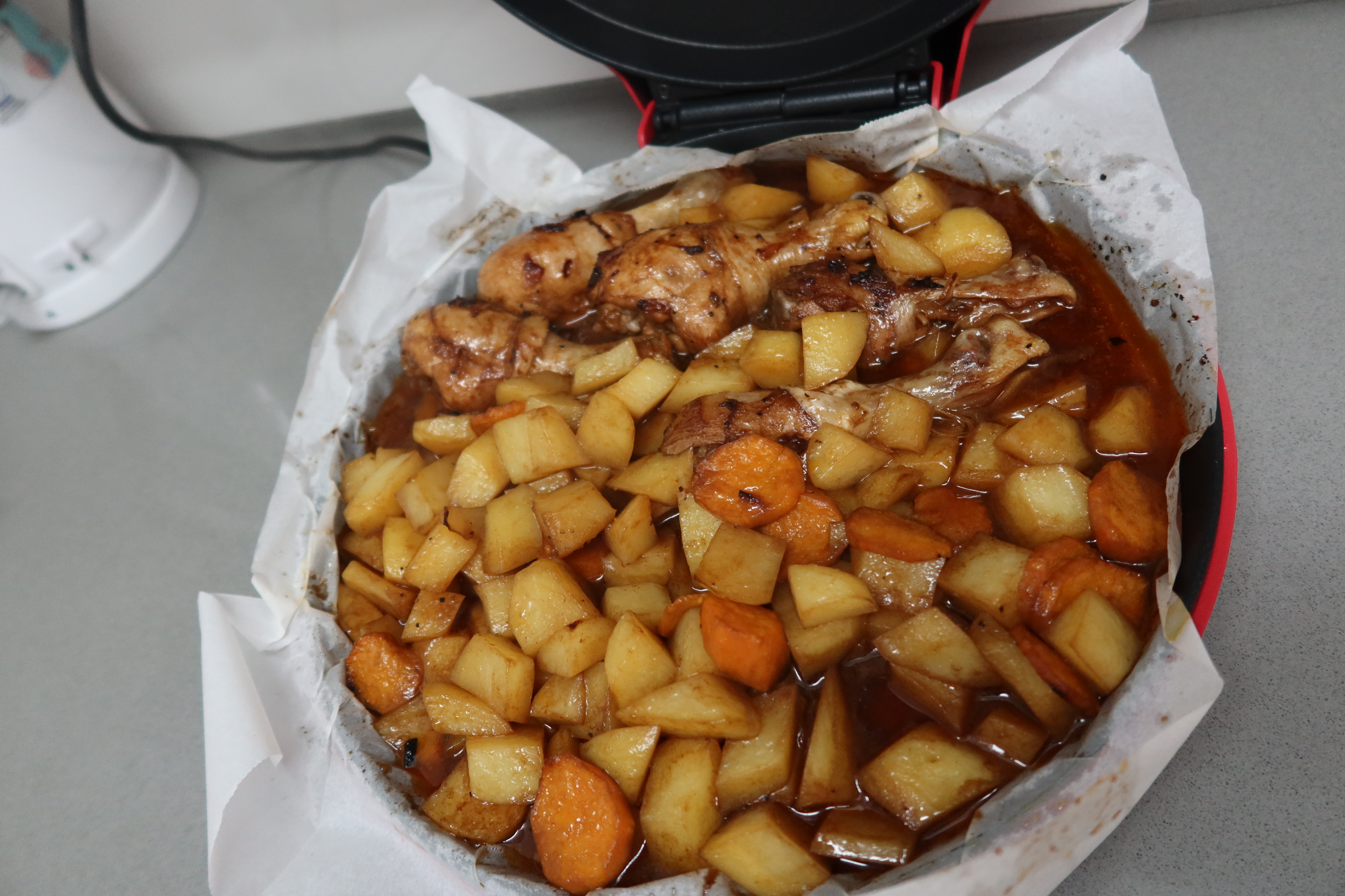 בבוקר אני מכניסה את זה למיניקיטשן מכוסה בנייר כסף (העוף עדיין קפוא חלקית), מחברת לשעון שבת,