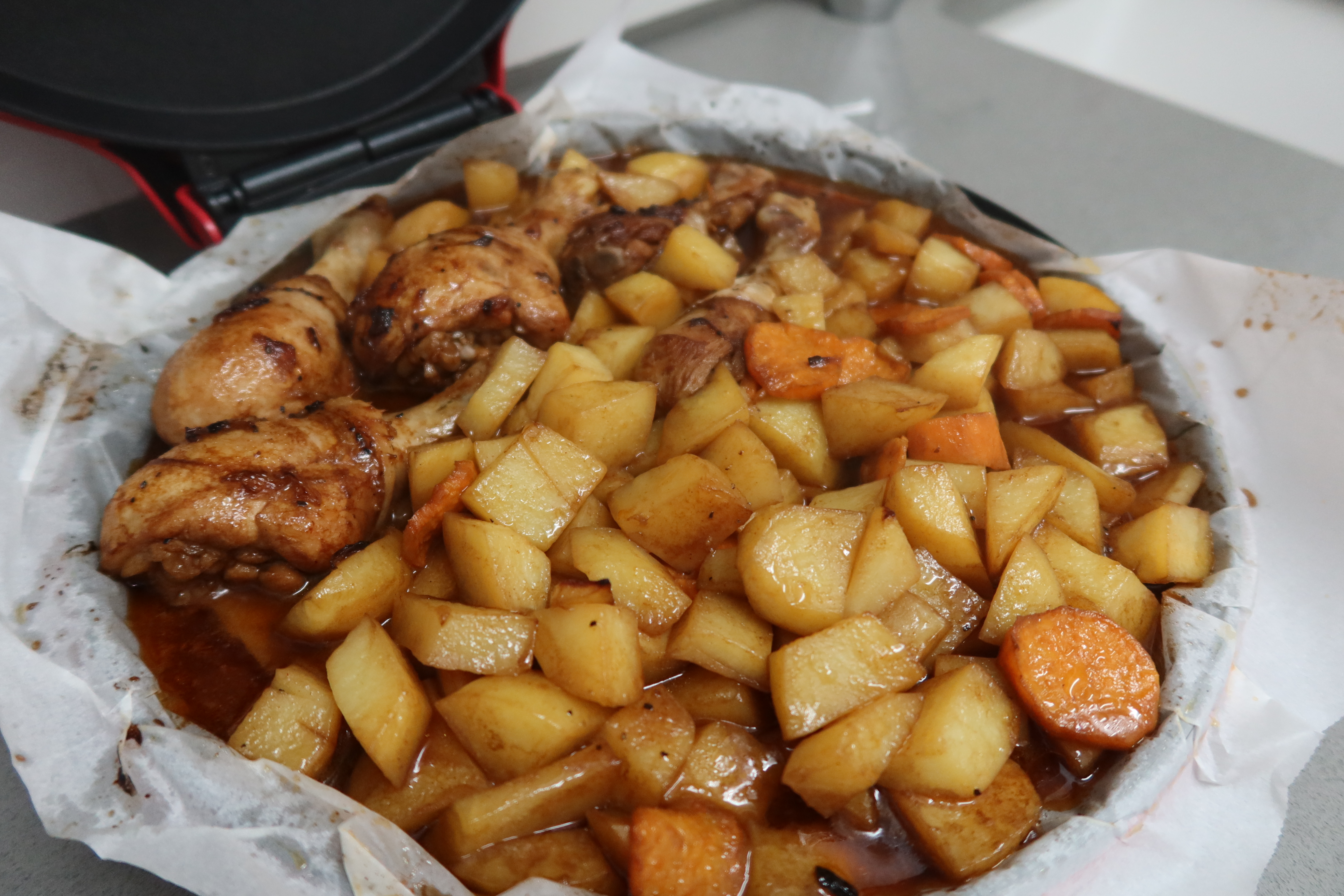 ואז הכנסתי את העוף לחצי שעה,ואחרי חצי שעה, הוספתי את התפוחי אדמה לעוד 40 דקות-כולם ביחד,