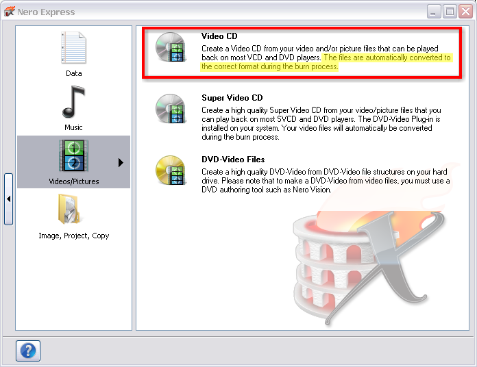 יש לאבא שלי מכשיר DVD לא תומך dvix ברכב והוא רוצה שאצרוב לו כל מיני קבצי וידאו (הרצאות וכדו') שיש לו בדיסקים בבית - הבעיה היא שבשיטת הצריבה הרגילה של NERO זה לא עולה לו.