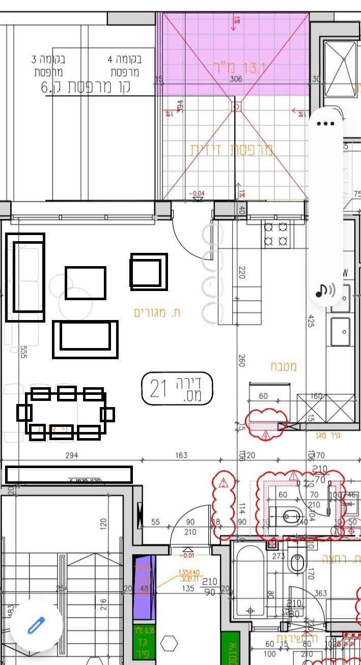 מצרפת תכנית מיזוג (בצבע תכלת) מעל הסלון