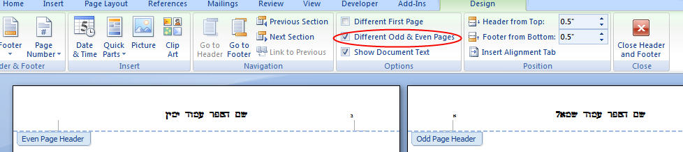 מימין או משמאל אצל הכותרת, ולהגדיר different add & even pages.