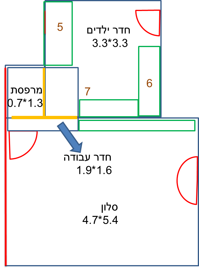 א. אני לא הייתי מוותר על המעבר מחדר הילדים לסלון כ"כ מהר. (האם את השלחן -7 - אפשר לשים על הקיר לכיוון הסלון או שזה יפריע לפתיחת הארון? או אפי' להשאיר דלת שתהיה נעולה בד"כ).