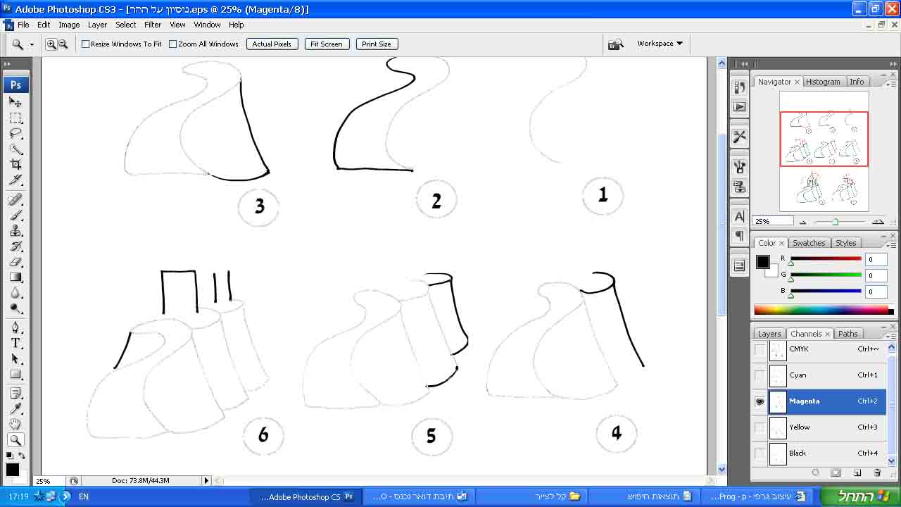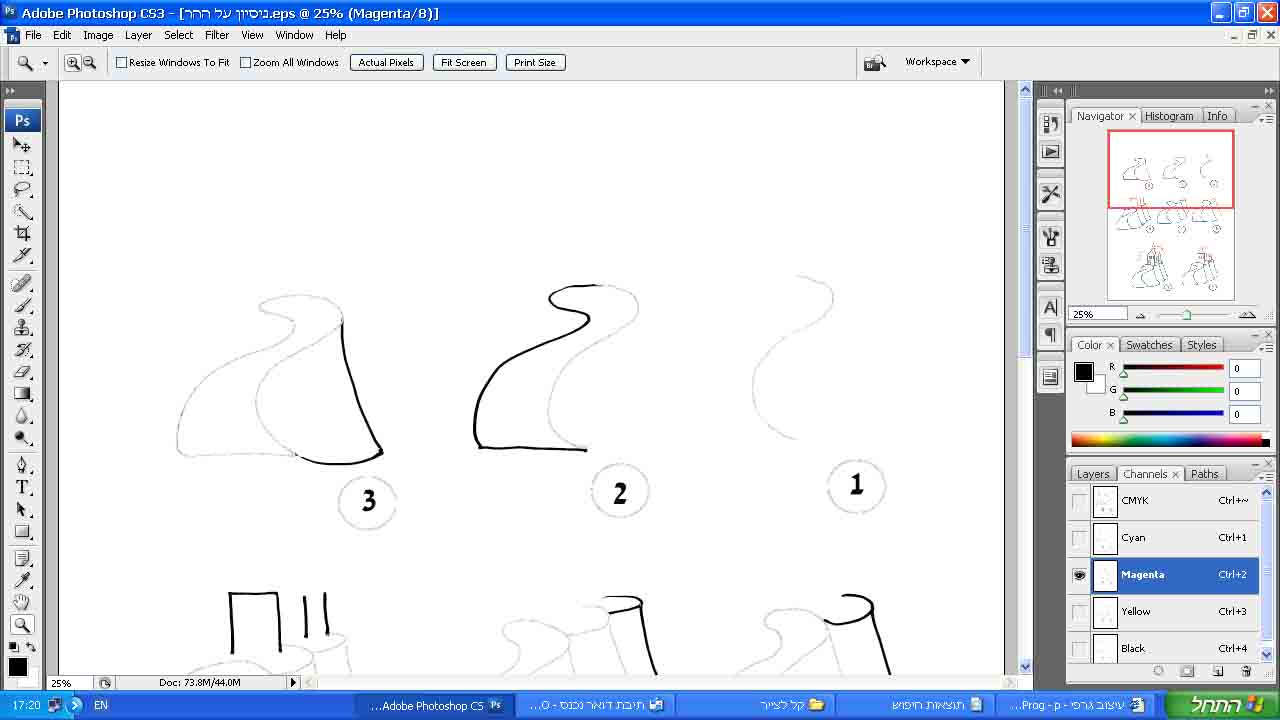 הציורים היו בעט אדום ובעט שחור, נסרקו במכון כלשהו, וקיבלתי אותם בCMYK. הלקוחות רוצים שיהיה אפשר להדפיס אותם בשני צבעים - M ו K. הבעיה היא שבסריקה נתקבלו צבעים לא נקיים בכלל, ובכל אחד מן הערוצים יש לי שאריות גם מן השחור וגם מן האדום. לכן אני בוחרת כל פעם את הערוץ שמה שכהה ובולט ביותר בו הוא השחור, מנקה ממנו את כל הבהירים (שהגיעו מן האדום), ומעתיקה את התוכן לערוץ הK. אני בוחרת את הערוץ שהאדום בו הוא הבולט ביותר, מנקה ממנו את כל הבהירים יותר - שהם שחורים במקור - והופכת אותו לערוץ הM. את שני הערוצים הנוספים אני מרוקנת.
