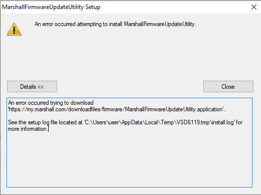 אני מנסה לעדכן קושחה למגבר מרשל לגיטרה חשמלית (נקרא CODE), הורדתי מהאתר שלהם את התוכנה (זה הקישור https://my.marshall.com/support/firmwareupdate), ומשום מה בתהליך ההתקנה מופיעה לי הודעת שגיאה שצירפתי תמונה שלה למטה.