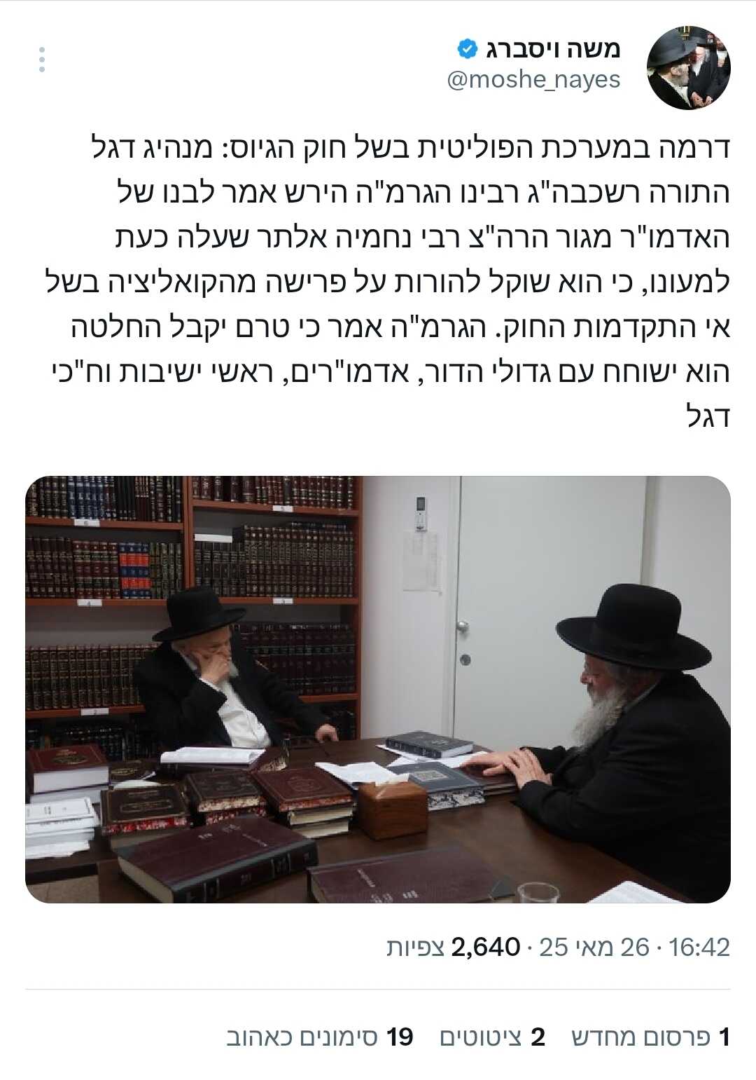 עמית סגל: המנהיג החרדי ליטאי הגאון רבי משה הלל הירש אמר לבנו של האדמו״ר מגור הרב נחמיה אלתר, שנשקלת האפשרות לפרוש מהקואליציה בשל אי התקדמות החוק. הרב הירש אמר כי טרם יקבל החלטה הוא ישוחח עם מנהיגים חרדיים נוספים וח״כי ׳דגל התורה׳.​