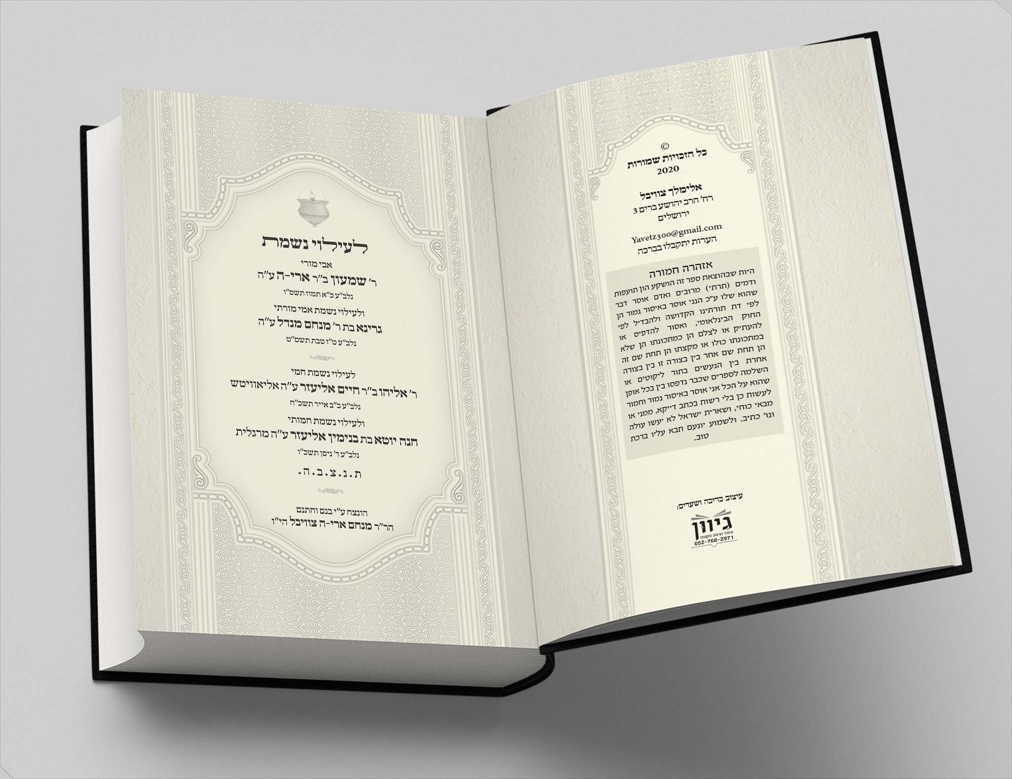 הרעיון הוא שיזכיר איכשהו שער עם עמודים, אבל לא רצה ממש שער ועמו'.. אז זה התוצאה.לדעתי היה עדיף לעצב את המסגרת בכריכה ובשאר העמ' - באופן סימטרי לחלק העליון (כמו בהנצחה ובחוצץ)