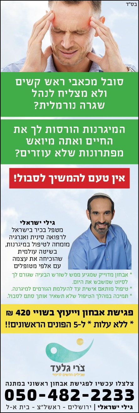 עצה מנוסה למיגרנה: (התפרסם ברשות הרבים לפני כמה שנים, ומאז כבר כמעט ואין מיגרנות!)