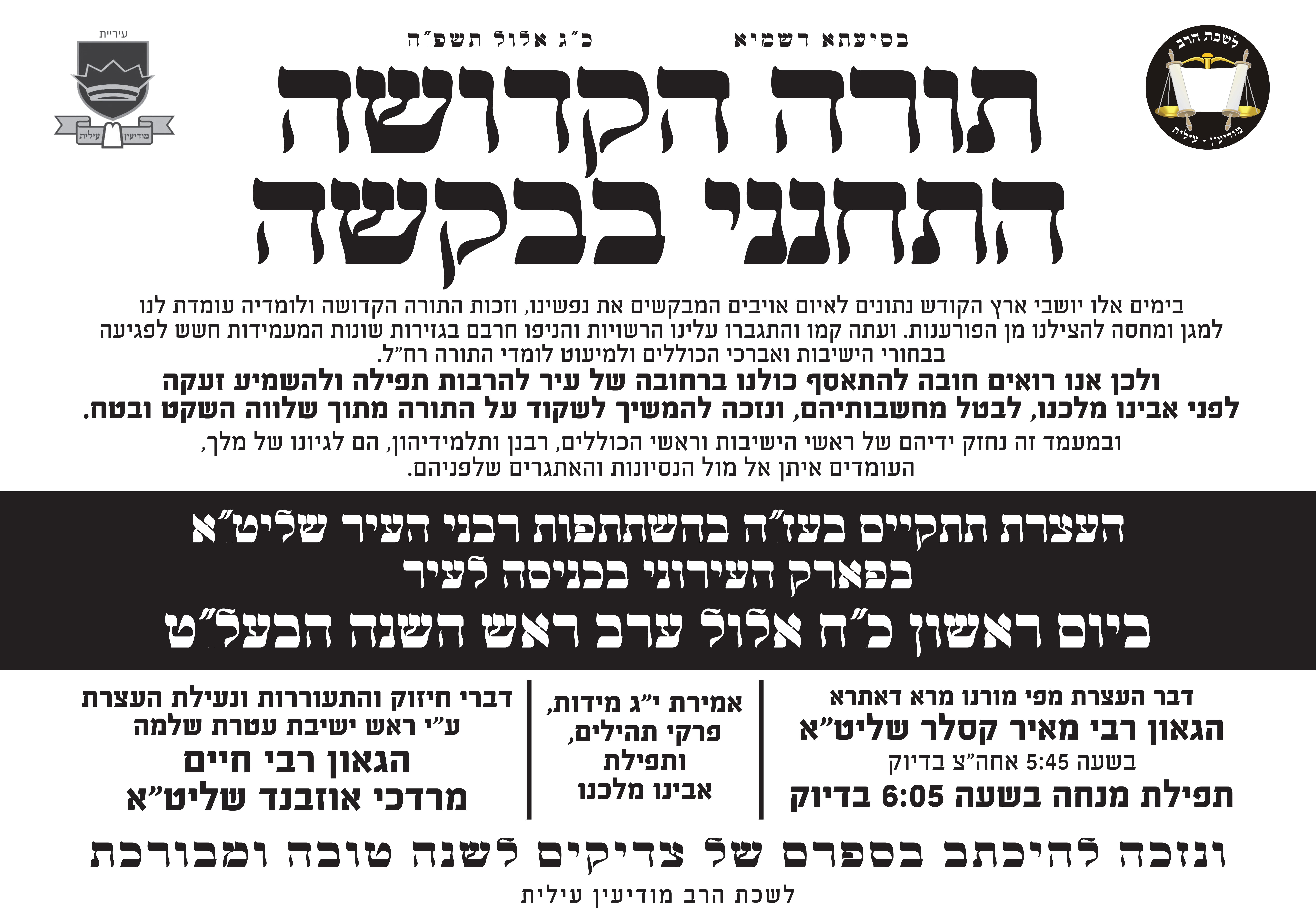 מידע שימושי עצרת תפילה במודיעין עילית יום ראשון כ"ח אלול בראשות רבני העיר