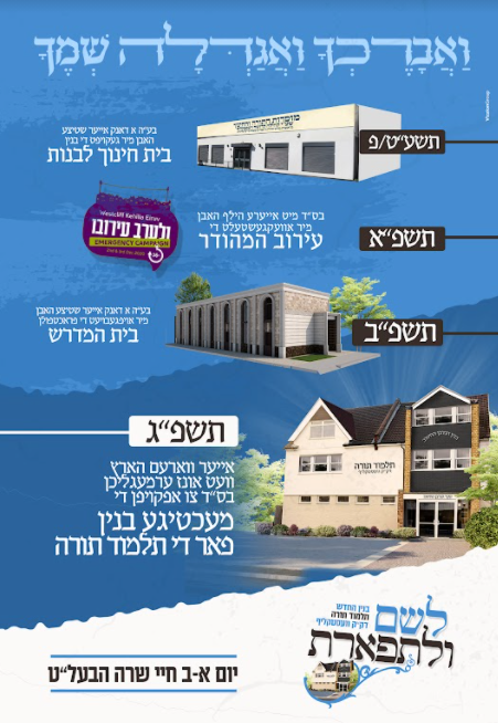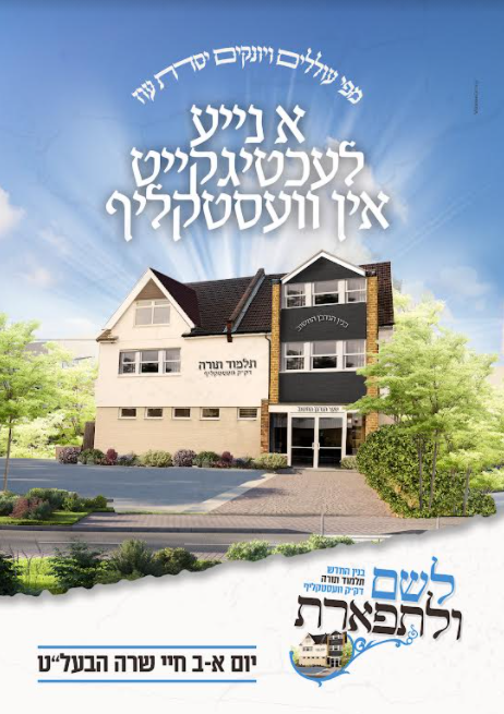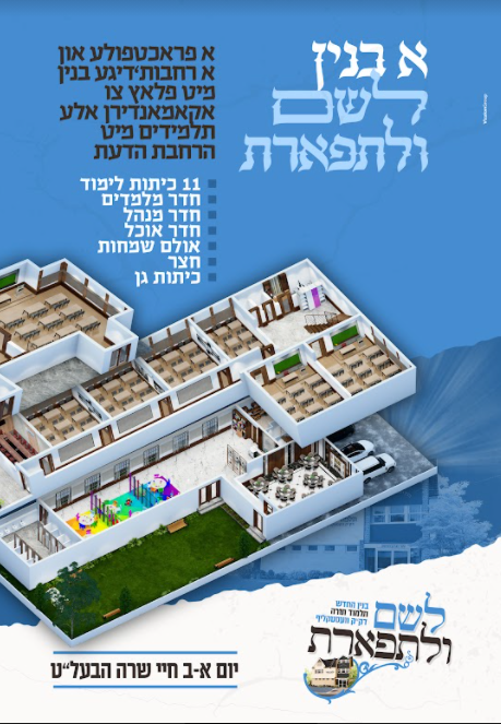 כי עתה הרחיב ד' לנו – בשבח והודאה להשי"ת, הצלחנו לאחר עמל ויגיעה רבה למצוא בנין מתאים עבור התלמוד תורה. הבנין, אשר נמצא בלב לבה של האיזור החרדי, מתאים באופן נפלא למטרה שבעז"ה ישמש מעתה, ומכיל בקרבו: