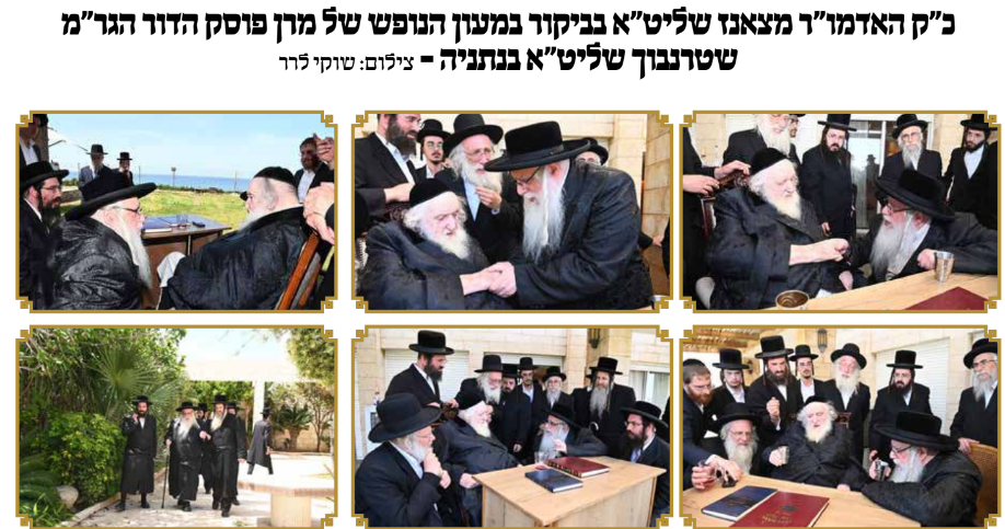 האדמו"ר מצאנז אמש ביקור מיוחד בבית האכסניא של פוסק הדור הגר"מ שטרנבוך, השוהה בימים אלו למנוחה בדירת נופש בקרית צאנז בנתניה.