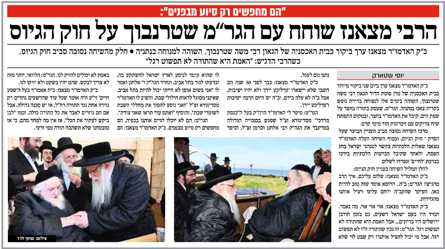 בהמשך דיבר בחריפות כי אין מה לדבר על 'פשרות' בנושא חוק הגיוס, "בזמנינו גזרו הפושעים גזירת גיוס על הציבור החרדים לדבר ה', וצריך לידע שעפ"י דין תורה אסור להתפשר עמהם כלל, וכדי להינצל מהגזירה צריך 'מסירות נפש' לשמור על התורה הקדושה בלא שינוי, ולהודיע להם באופן ברור את האמת שאנחנו נמסור את הנפש ולא נלך לצבא שלהם, שעפ"י דין תורה אסור לנו ללכת"."ואם אנחנו נהיה חזקים כחומה בצורה, אז הם יהיו חלשים ולא יוכלו לעשות לנו כלום, ואף הם עצמם יודעים כן שאם אנחנו נעמוד מולם חזקים כחומה בצורה, הם לא יוכלו לעשות לנו מאומה".