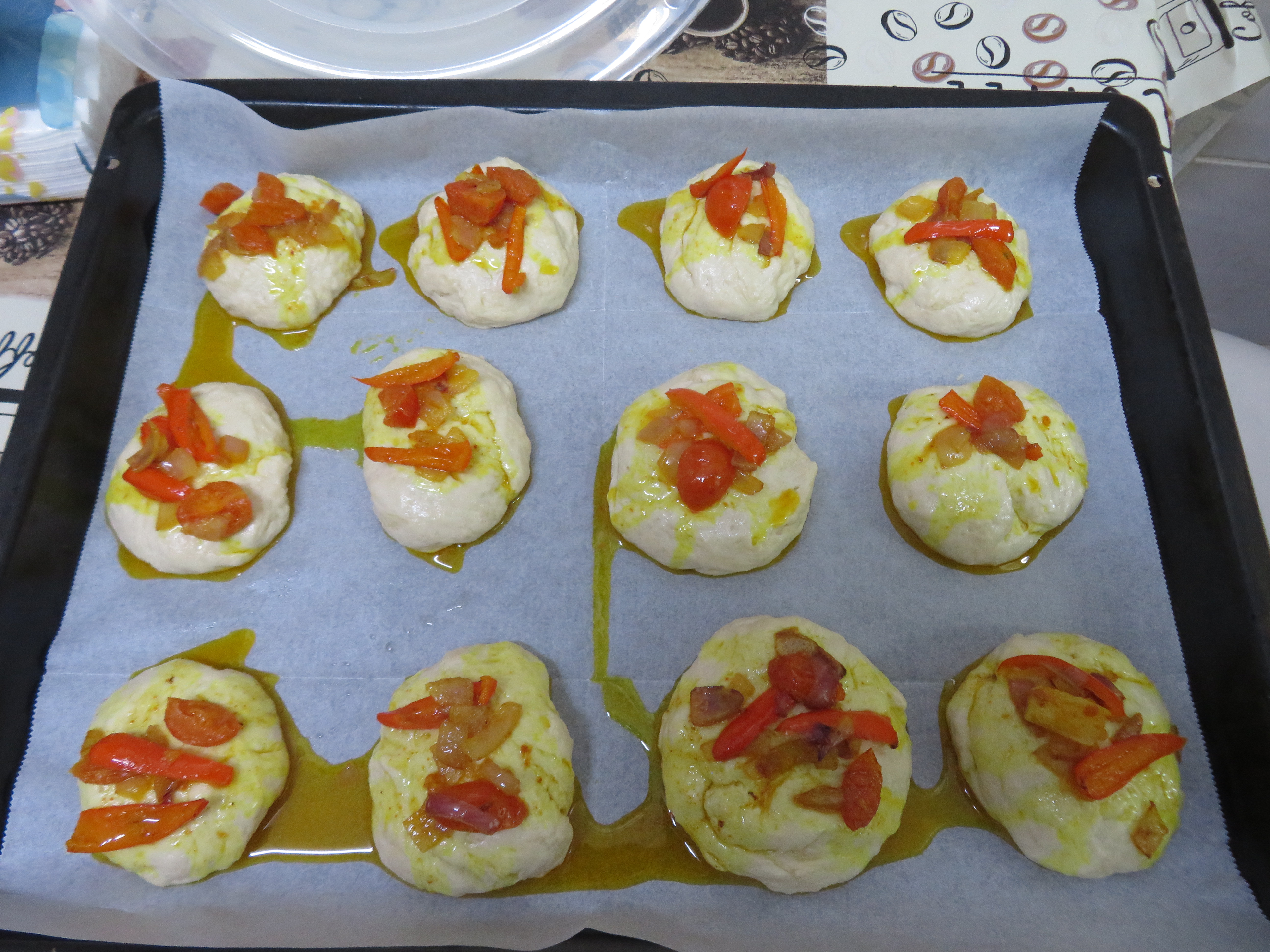 לאחר חצי שעה קורצים ביד משומנת עיגולים קטנים ומסדרים על תבנית עם נייר אפיה מועכים מעט לצורת לחמניה או פוקאצ'ה מוארכת או אצבעות/גליגלים ומקשטים כרצונכם.