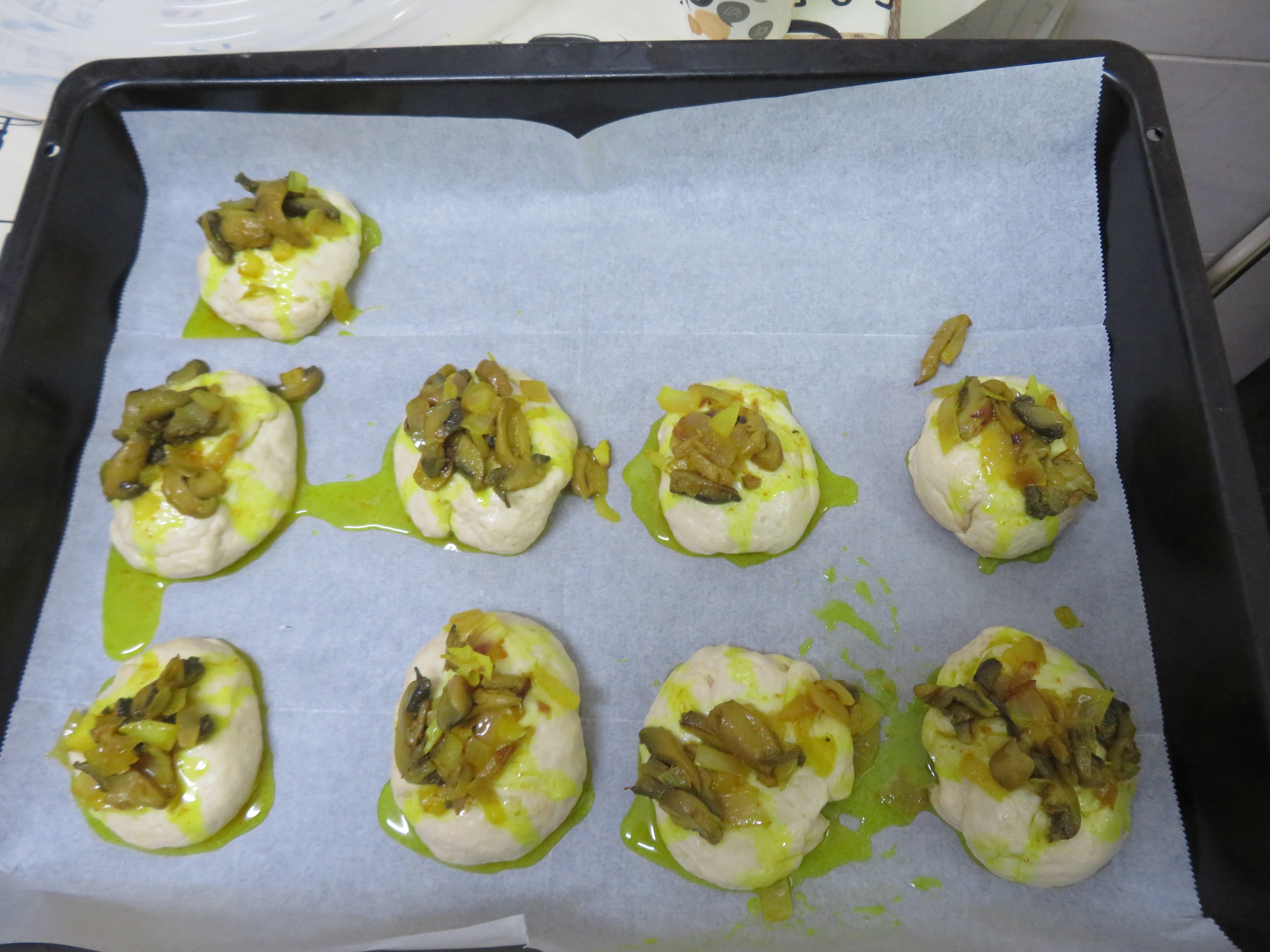 7. מניחים על גבי תבנית תנור מרופדת בנייר אפייה במרווחים.