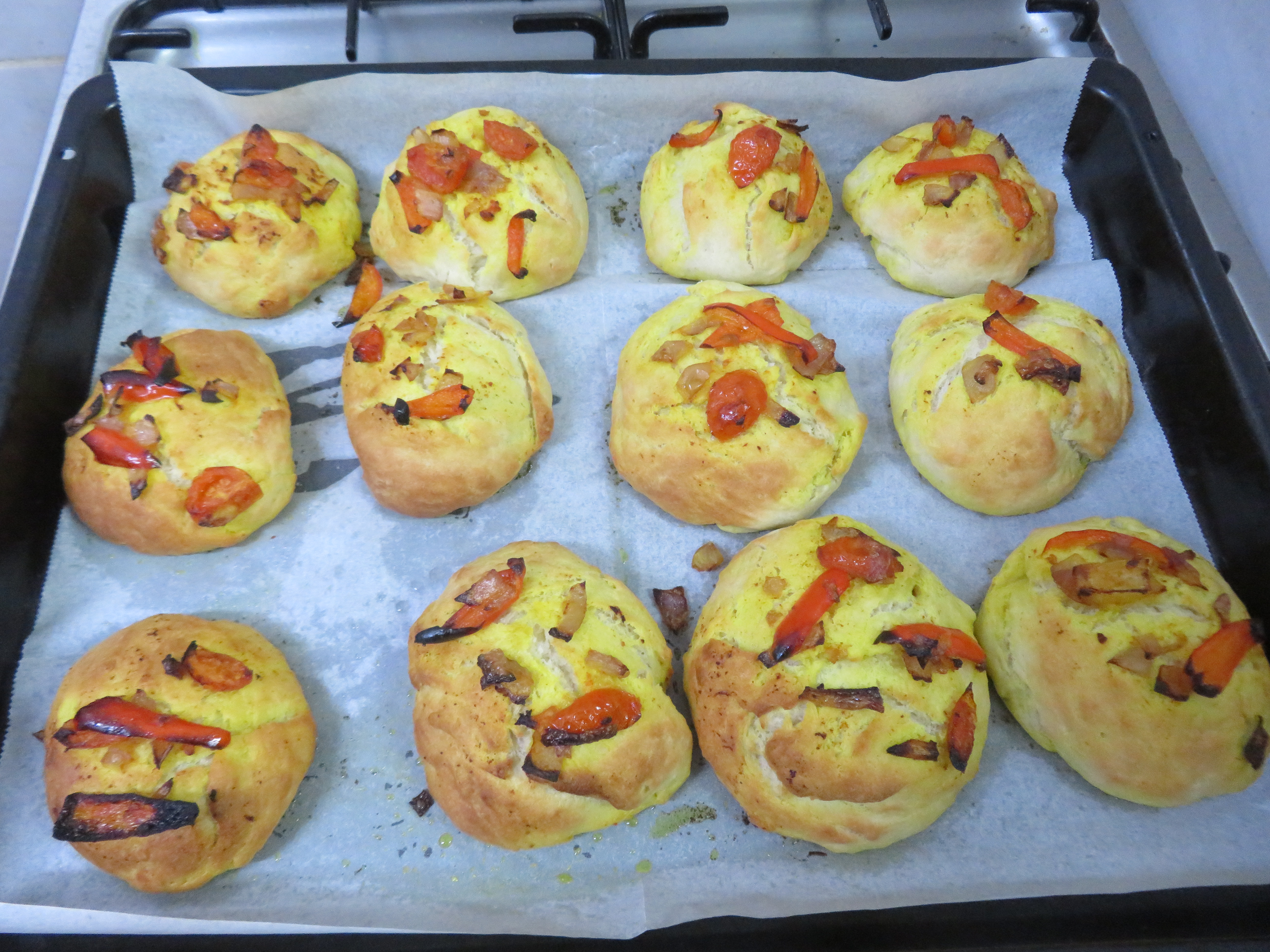 בנגלה אחת- בצל סגול,פלפל אדום ועגבניות שרי מאודות עם שמן,מלח,פפריקה אדומה וכרכום.
