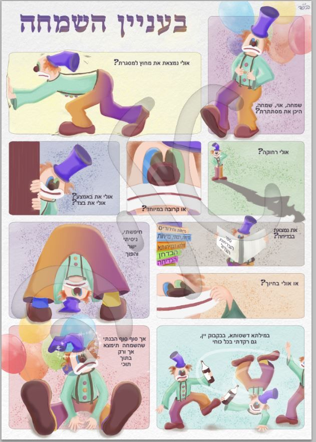 קחי לתשומת ליבך הארה קטנה - לדעתי, במשבצת האחרונה שבה הליצן מגיע למסקנה שהשמחה נמצא דוקא בתוכו - הוא אמור להיות שמח ומאושר:)!