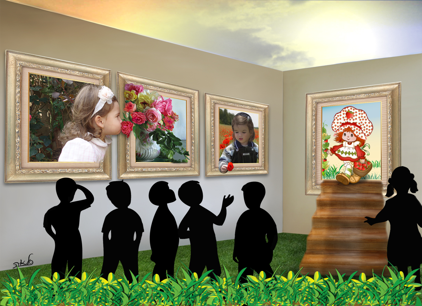 הילדה משמאל מצולמת כך, רק חצי גוף עליון כשבמקור היא מריחה ורד אז חיברתי בינה ובין הזר, אילוצים של צילום עם ציור...:)