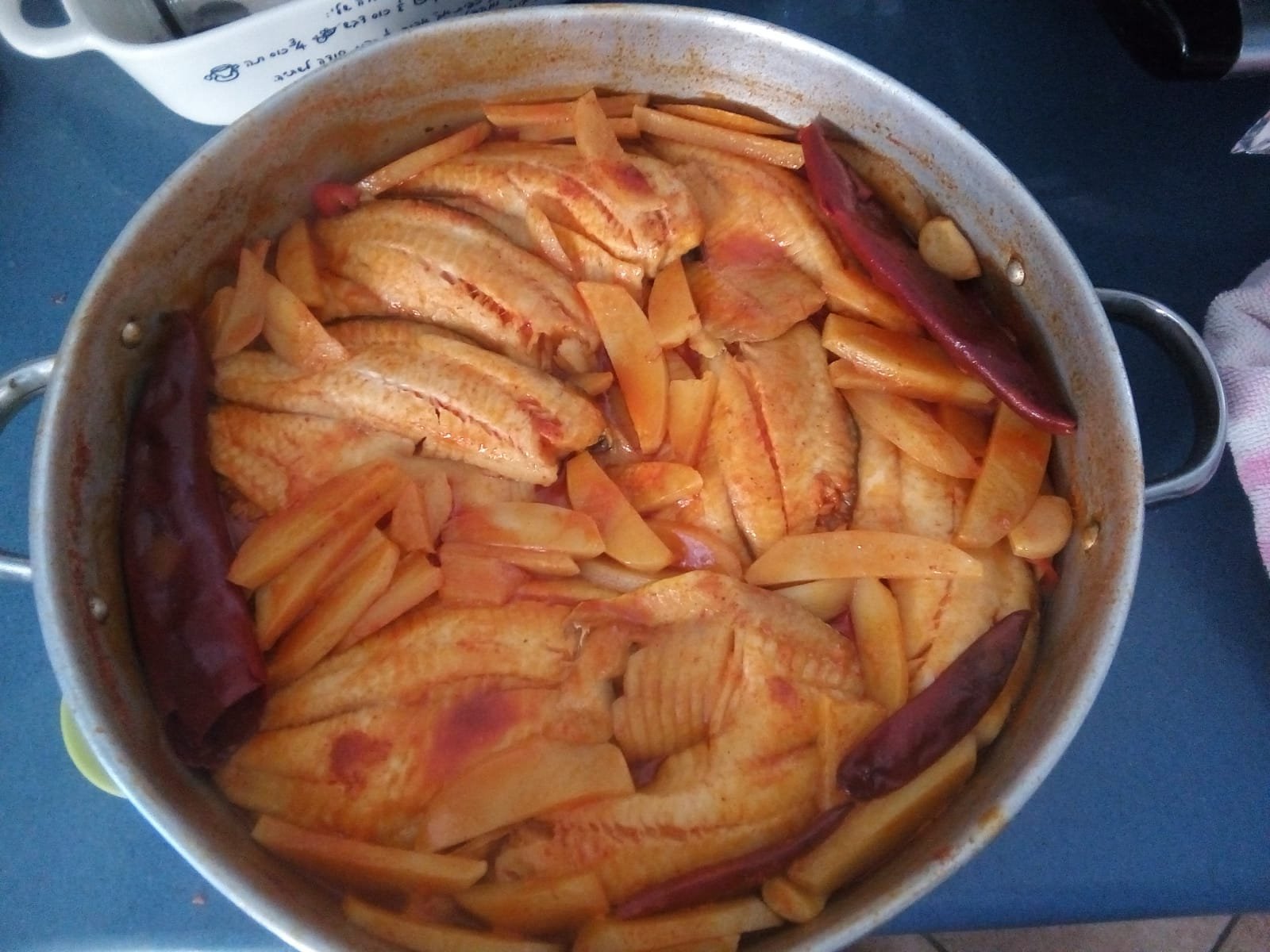חותכים תפוחי אדמה שוטפים ומפזרים אותם בתוך הסיר (אני חתכתי כל תפוח אדמה לחצי ואז מקלות רחבות ודקות).