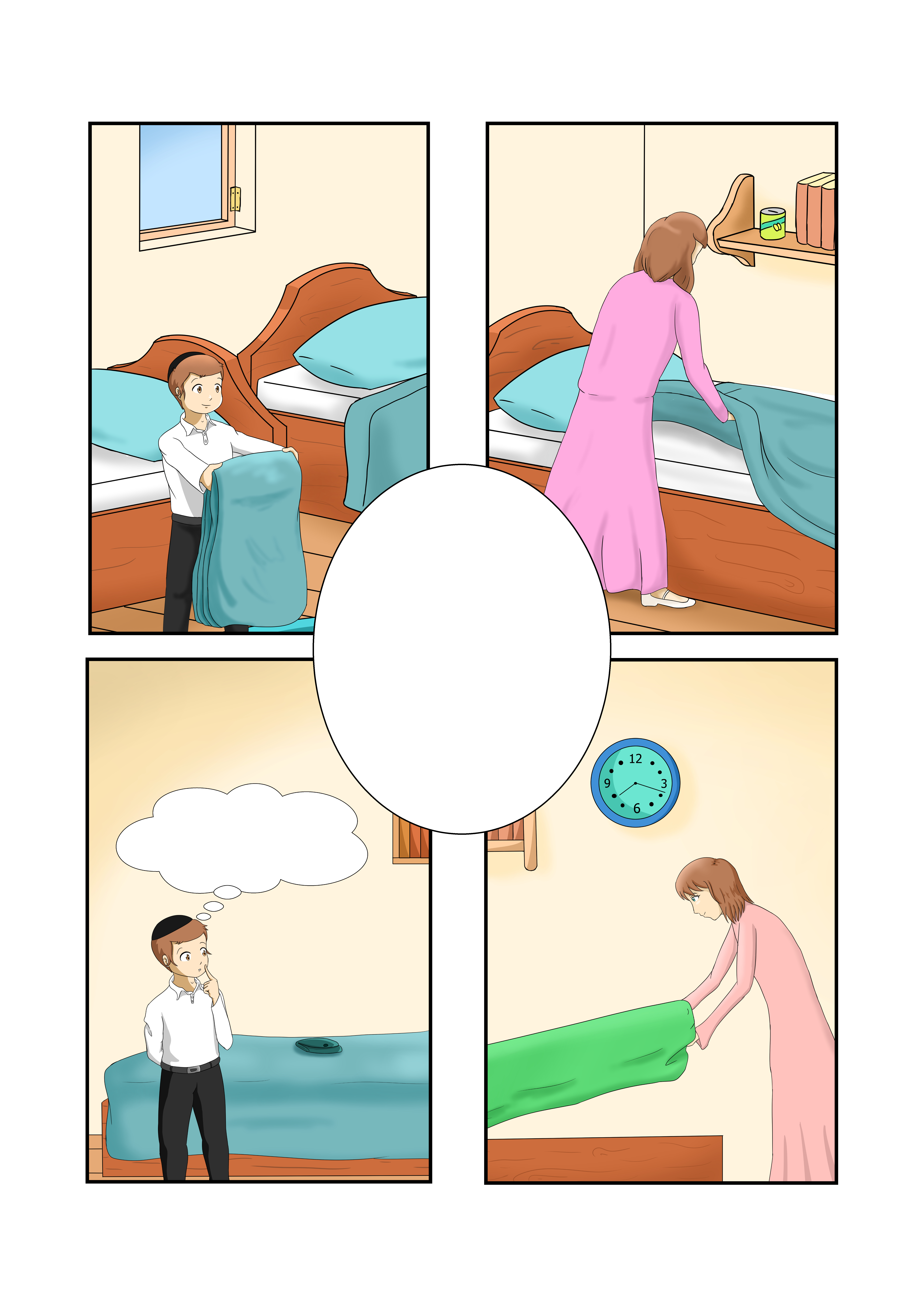"יהודה", אבא מחייך חיוך רחב, ומניח יד חמה על כתפי. "שמחה של חג איננה רק צחוק גדול או שירה בקול. לפעמים השמחה היא הודיה שקטה, רגע של קרבה לאנשים שאוהבים, או אפילו הכרה טובה על דבר קטן, כמו גבינה טרייה או עזרה לאמא. התורה מצווה עלינו לשמוח כי השמחה מחברת אותנו אל הקב"ה, אל עם ישראל, ואל עצמנו. כל מעשה טוב שאתה עושה, כל מחשבה של תודה, היא חלק מהשמחה הזו".