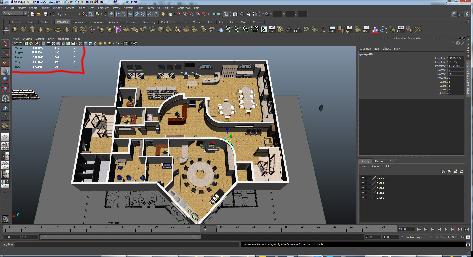 אני עובד כעת על הדמיה של מבנה, אחת הקומות יש שם ממש המון פריטים והסצנה יש בה מיליוני פוליגונים כפי שתראו בתמונה (מסומן באדום), האמת שנורא קשה לעבוד על כזו סצנה כל פעולה שאני עושה כמו אקסטרוד וכו' לוקחת מס' שניות ולפעמים יותר שלא לדבר על שמירה שבמקום שישמור בשניה לוקח לו לפחות 20 שניות, אולי אני יעלה רנדר של זה בעתיד.