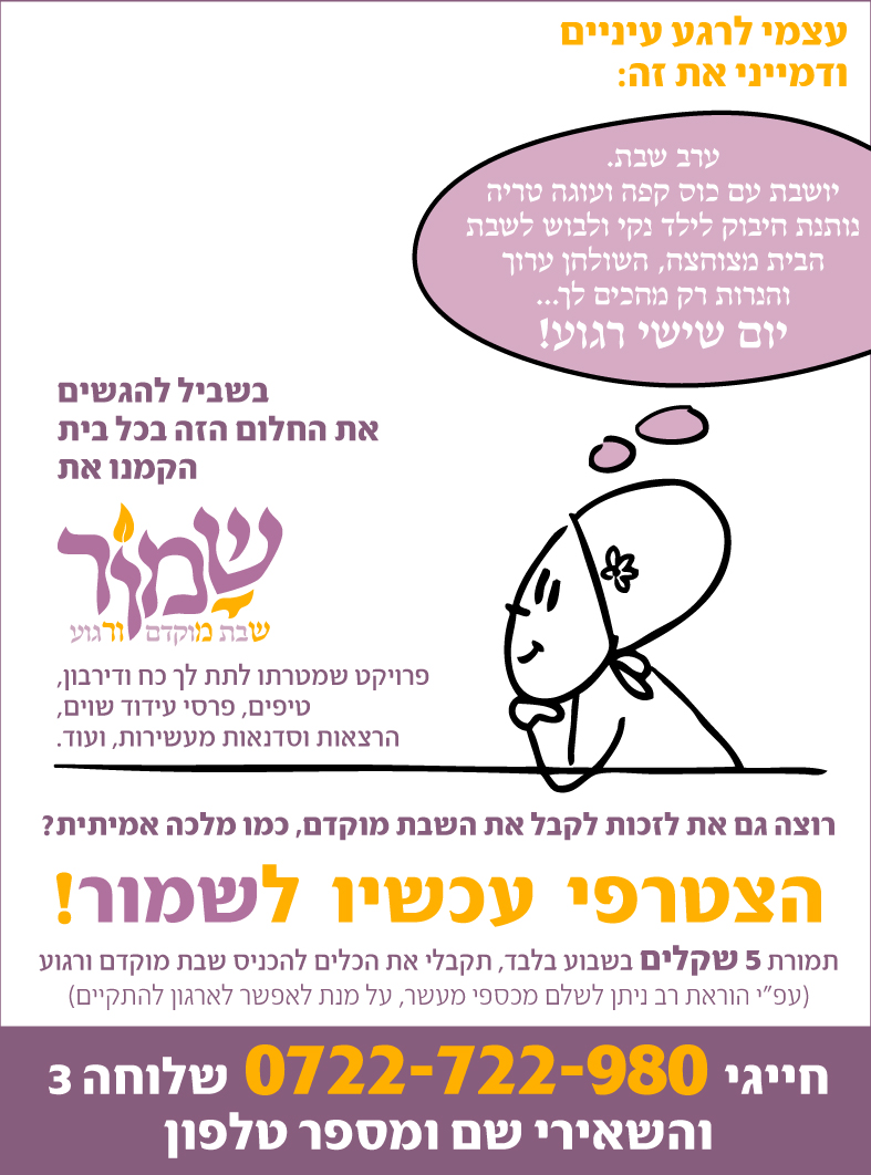 הפרויקט נקרא "שמור" - ראשי תיבות שבת מוקדם ורגוע.
