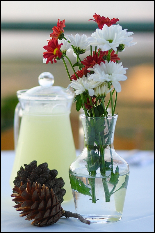 בכל אופן אני לא כל כך רואה קשר בין הדברים על השולחן.... אולי אם הייתה שם את הפרחים באחורה ואיפו שהפרחים הייתה שם כוס ואיפו שהאיצטרובלים את המיץ היה יותר מעניים וסיופור ולא סתם דוממים על שולחן....