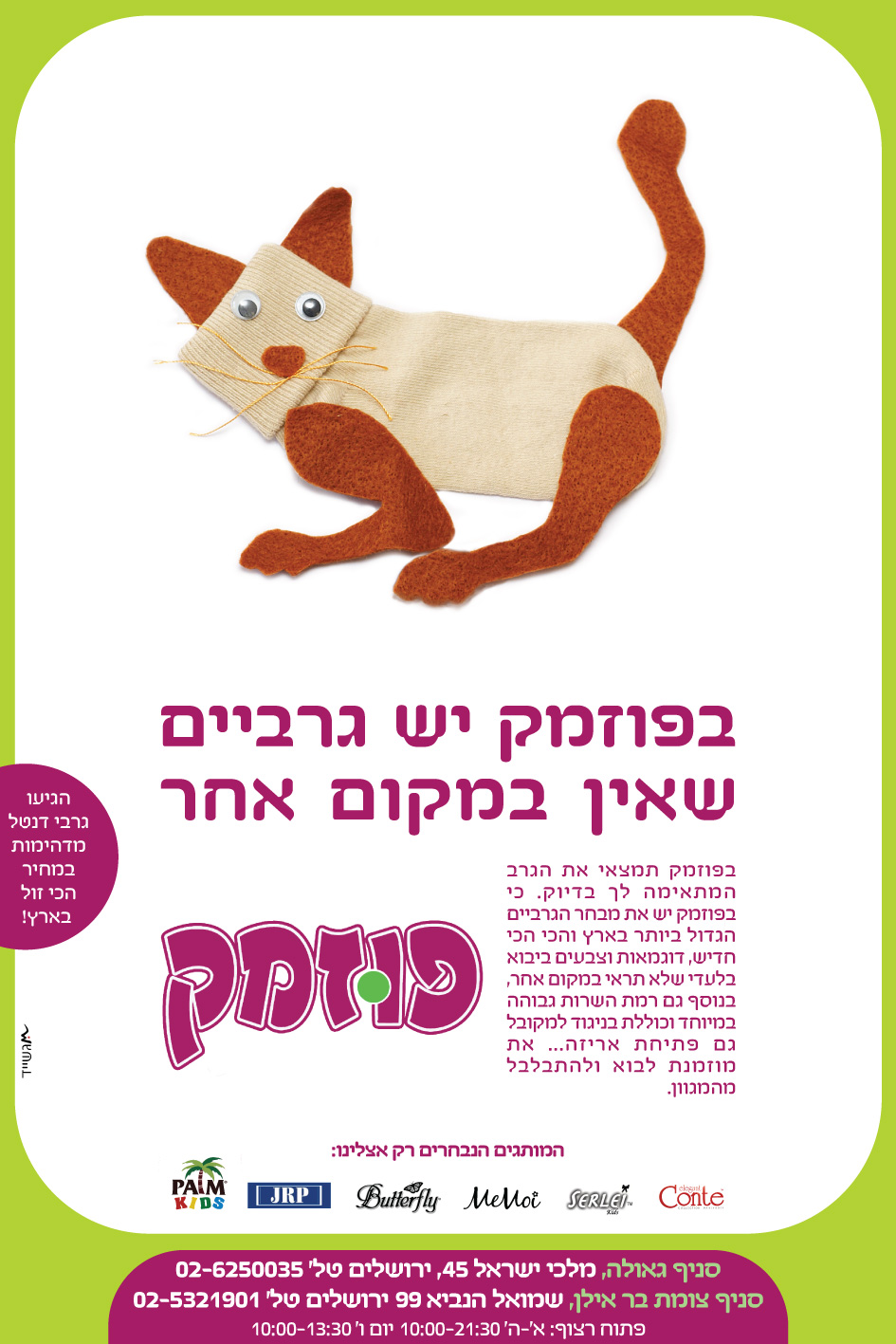 נכתב ע"י שילת_250;754640:כל כך אהבתי את הפרסום עד שטרחתי להגיע עד פוזמק, האמת היה משתלם כזה מגוון ענק איכותי ויפה!!! השירות אפילו בלחץ המטורף של ערב חג בחנות צפופה, הקיצור יצאתי מאד מרוצה!!!