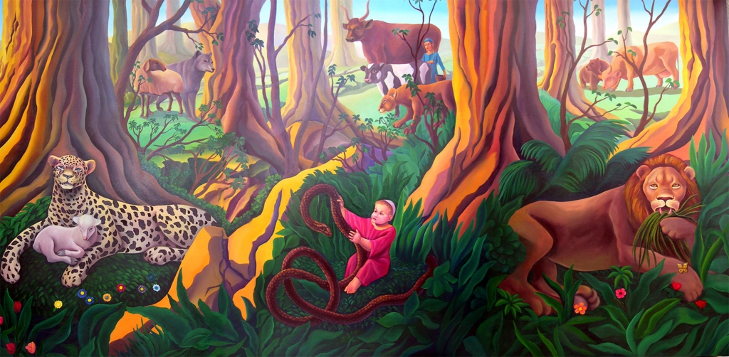 הציור האחרון מדהים איך שהאומן ירד לפרטי פרטים של הפסוק: "וגר זאב עם כבש ונמר עם גדי ירבץ, ועגל וכפיר ומריא יחדיו ונער קטן נוהג בם, ופרה ודב תרעינה יחדיו ירבצו ילדיהן, ואריה כבקר יאכל תבן, ושעשע יונק על חור פתן, ועל מאורת צפעוני גמול ידו הדה, לא ירעו ולא ישחיתו בכל הר קדשי".