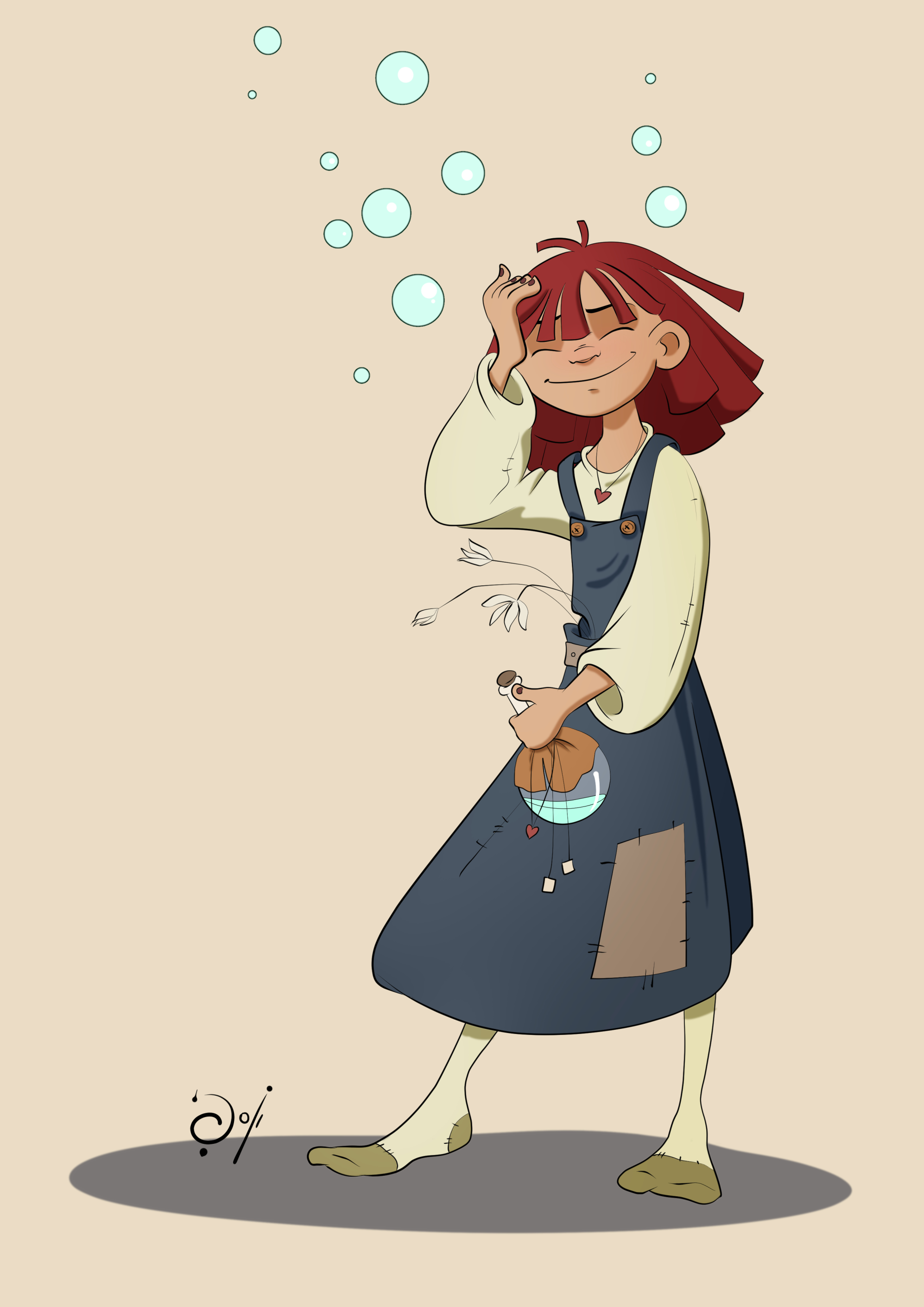 בסצנה המצויירת, נתפסה דמותו של העלם החביב בדיוק בשבריר השניה בו השק הכבד החליק פתאום עשרות סנטימטרים באחת כלפי מטה, תוך שהוא מושך אחריו את העלם המבועת האוחז בכל כוחו בשולי השק ומנסה לעצור את תנועתו הפתאומית. בדיוק ברגע זה, כיפתו של העלם טרם קלטה את המתרחש, ולכן נותרה היא במקומה הראשון טרם הורתה ולידתה של הסצנה...