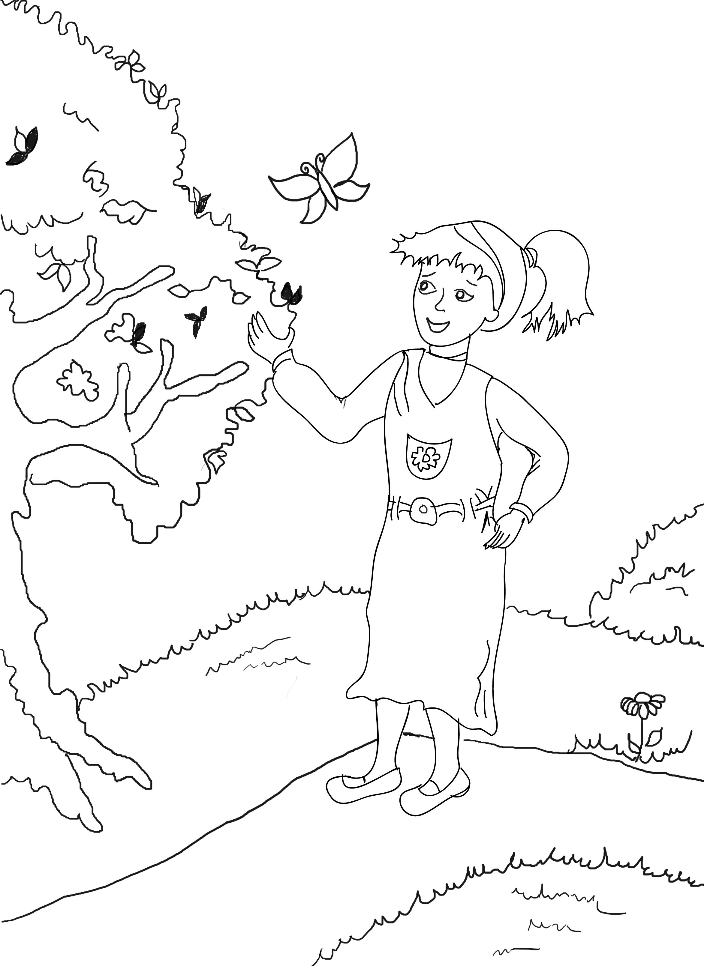 פרופורציות - הילדה כמעט בגובה העץ, הפרפר כמעט בגודל פני הילדה, והדשא הפוך.