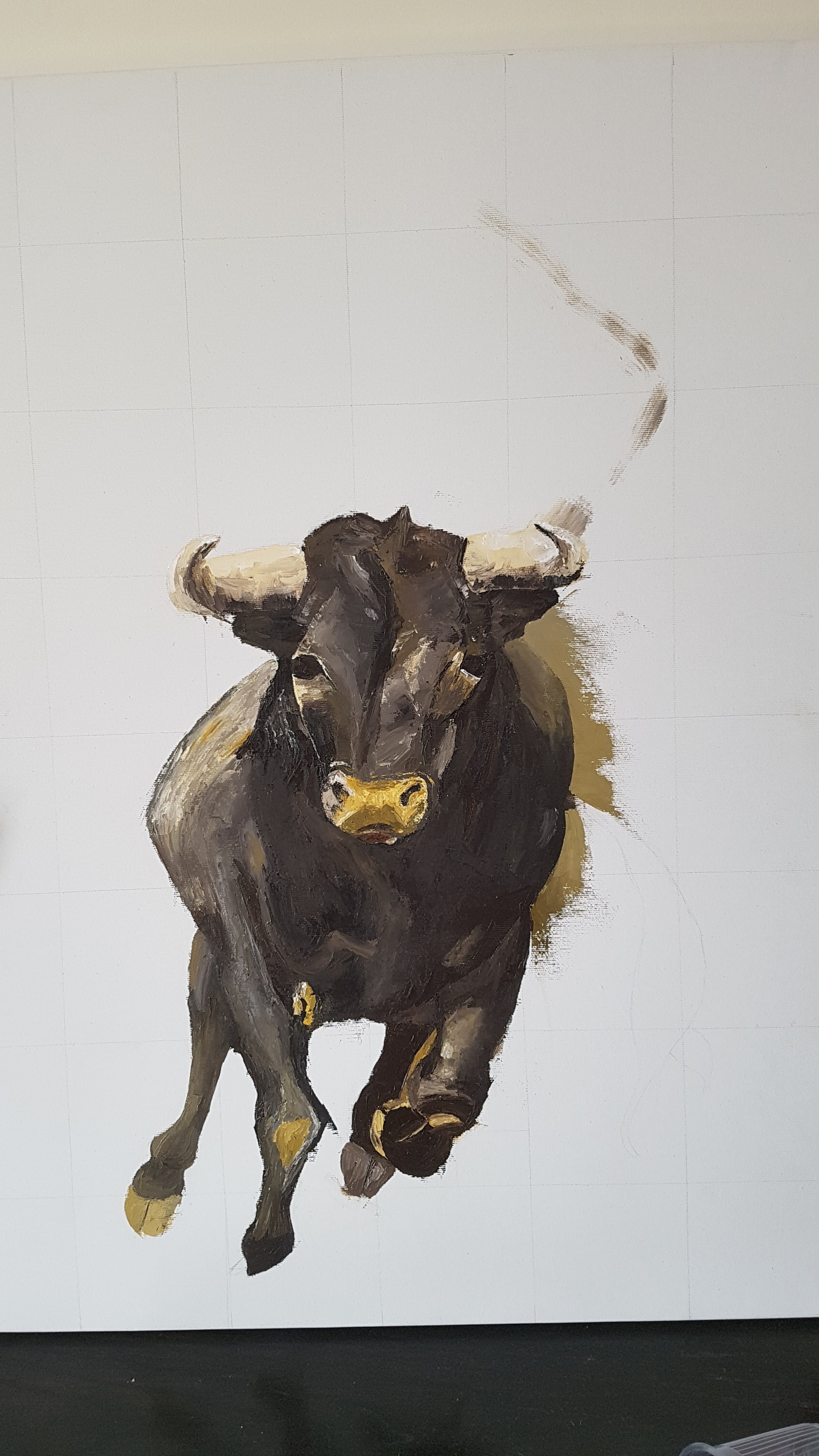 אני באמצע לצייר בשמן עם שפכטל שור במלחמת שוורים, וחול מתאבך סביבו. איך אני יכולה להראות על השור שכבה דקה של חול. מה הטכניקה הטובה לזה?