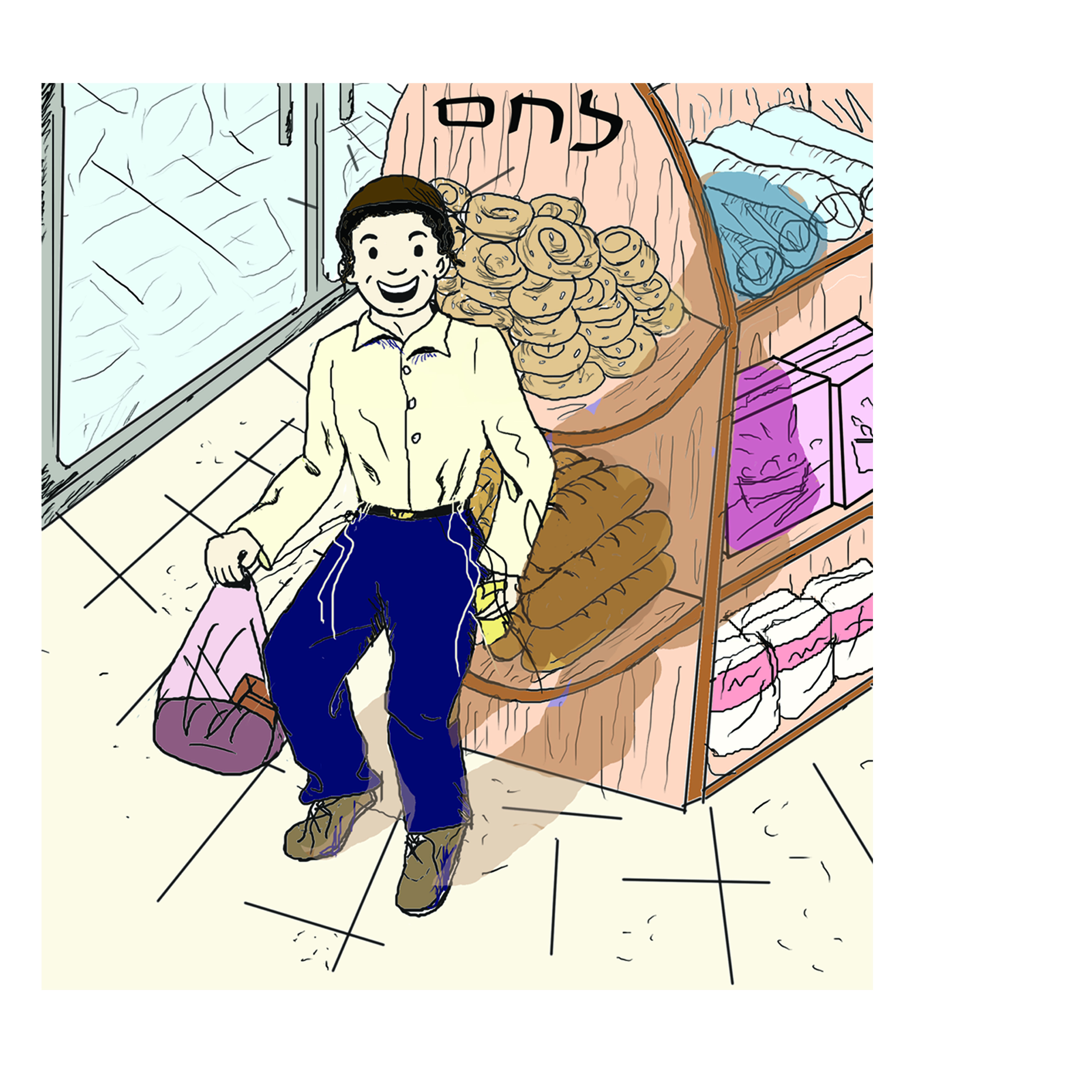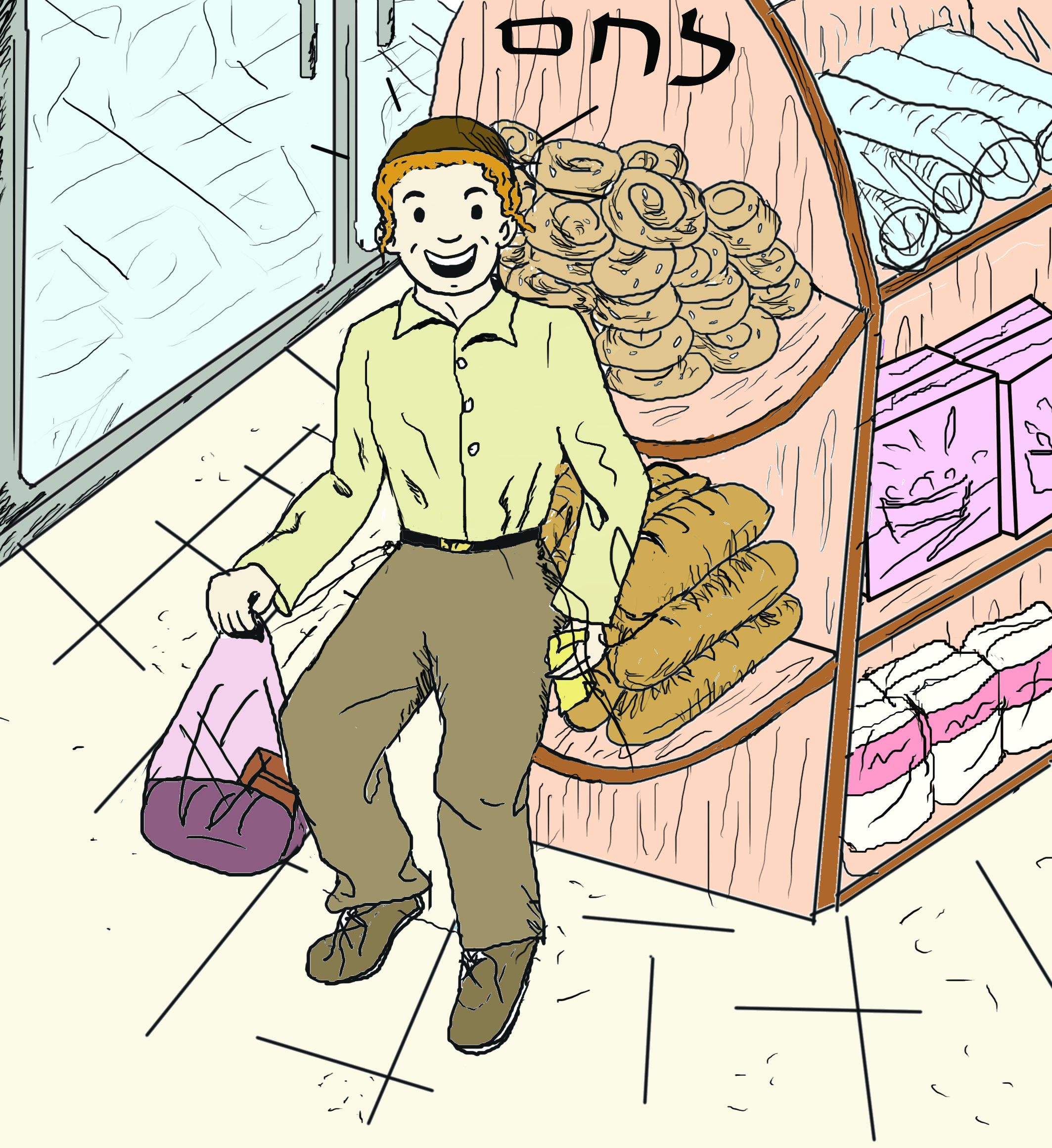 בתור התחלה זה בסדר, הייתי עובדת על זה עוד לפני השימוש בתמונה. למשל- הילד נראה כאילו הוא הולך ליפול הברכיים מידי מכופפות, הלחמניות העגולות נראות כאילו הן הולכות ליפול כל רגע מהמדף- המדף מידי נוטה כלפי מטה, האצבעות שמחזיקות את הנייר צריכות שיפוץ הן מידי שפיציות וגם האחיזה לא נכונה רק שתי אצבעות מחזיקות, הפתק צריך להיות בין האגודל לארבע האצבעות האחרות, כדאי לעשות כל תנועה בעצמך ולפי זה לצייר, או לצלם מישהו אחר בתנועה הרצויה.