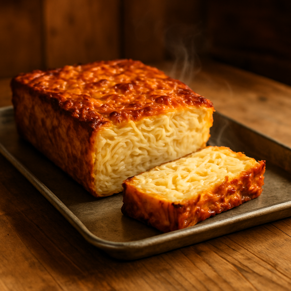 צילום אוכל כפרי ברזולוציה גבוהה של קוגל אטריות (פאי אטריות) מלבני בצבע חום-זהוב המונח על מגש מתכת פשוט, כאשר פרוסה אחת חתוכה ומונחת לידה על המגש. לפאי חלק עליון פריך ופנים רך עם אטריות גלויות. המגש מונח על שולחן עץ טבעי, בסביבה מטבחית כפרית חמה ונינוחה. תאורת הצד משפרת את המרקם ואדים עולים בעדינות מהחתיכה הפרוסה. עומק שדה רדוד. יחס גובה-רוחב של 1:1. קומפוזיציה מקצועית, מעוררת תיאבון וריאליסטית.