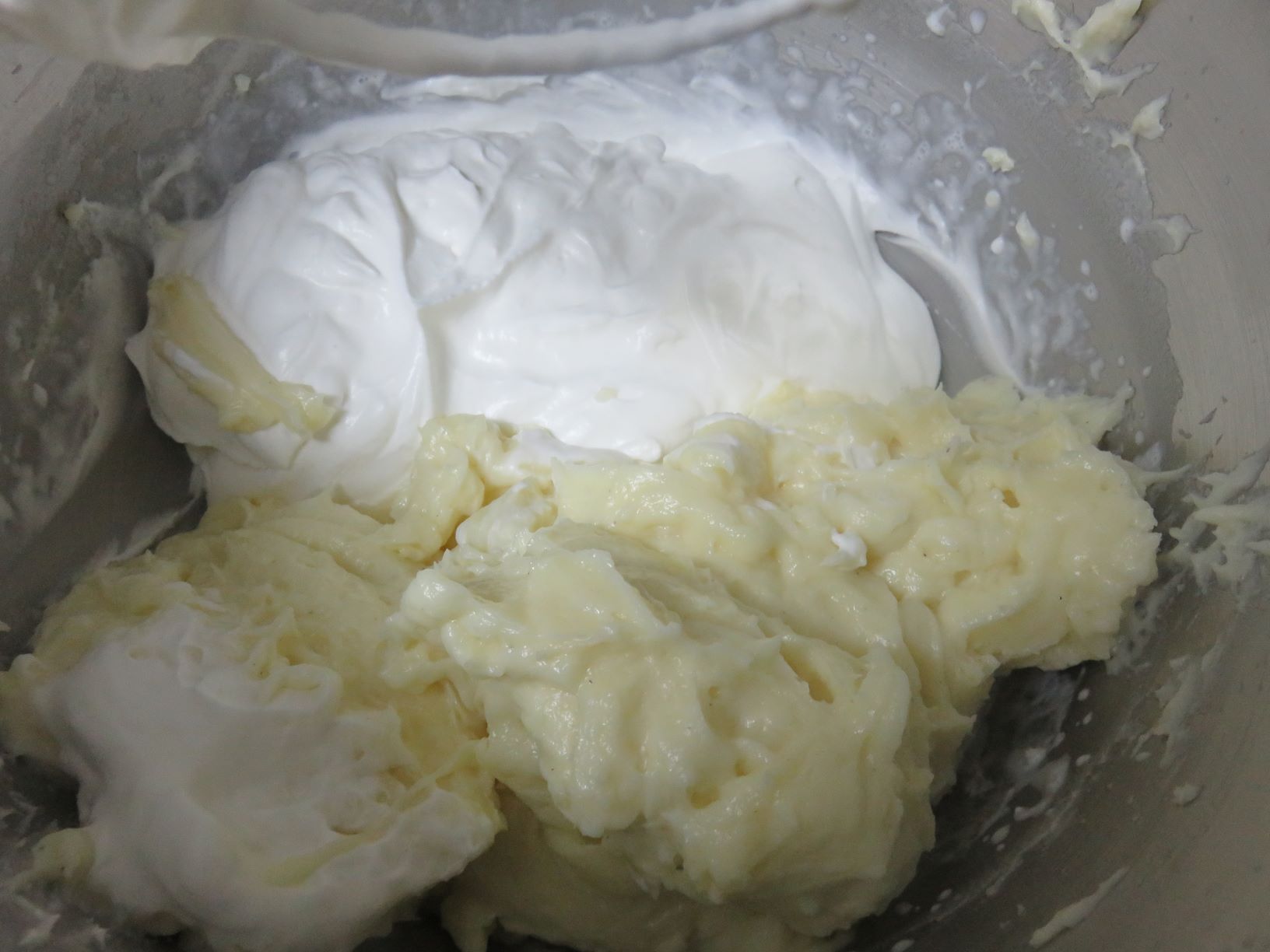 6. כעת אנחנו צריכים לקפל את שתי התערובות אך הכלל אומר: שיש לקפל מסה קלה אל תוך מסה כבדה ולא להיפך.