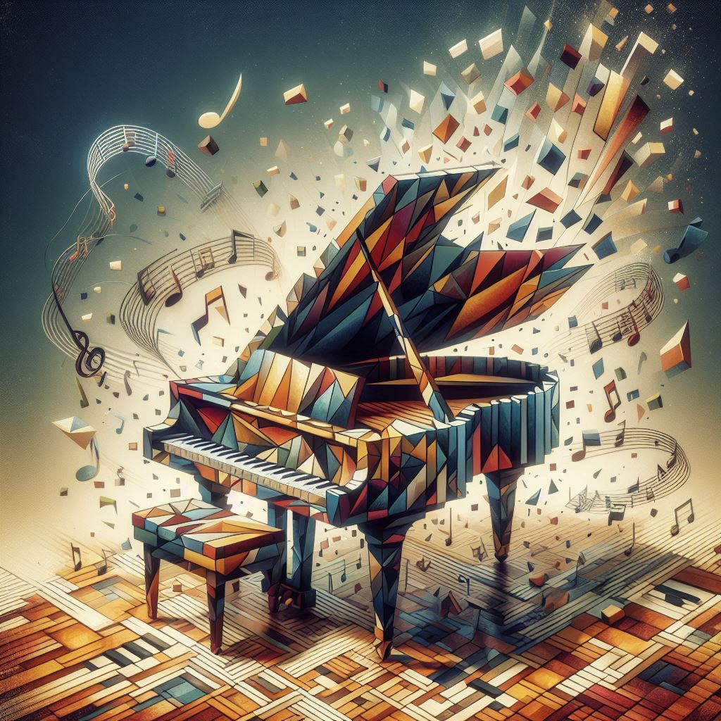 צור תמונה קוביסטית עכשווית של וחדשנית של פסנתר מרשים, שכולל משחק עם צורות גאומטריות, הצג את הפסנתר ממספר זוויות בו זמנית , ברקע מתעופפים כמו מתוך הפסנתר תווים