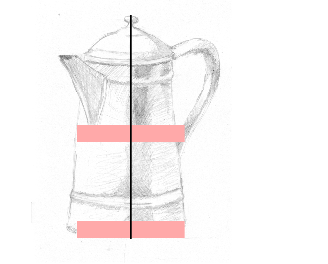 מעלה לכם ניסיון שעשיתי - תוכלו לראות את הקו הישר ומצידו שני מלבנים שווים בגודלם שיצרתי כדי להמחיש את חוסר הסימטריה בצידי הקומקום.