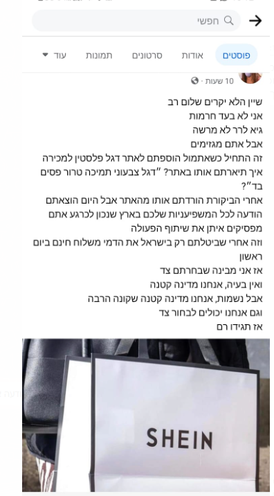 אתר האופנה "שיין" הוא אחד האתרים הפופולריים ביותר לקניית בגדים, בייחוד בקרב נשים דתיות. האתר מציע מגוון של חולצות, חצאיות ושמלות על פי כללי הצניעות, במחירים זולים בהרבה מהשוק. אלא שעכשיו, כשמלחמה נוראית מתחוללת בין ישראל ועזה, האתר החליט לתפוס צד וחשף פנים אנטישמיות.