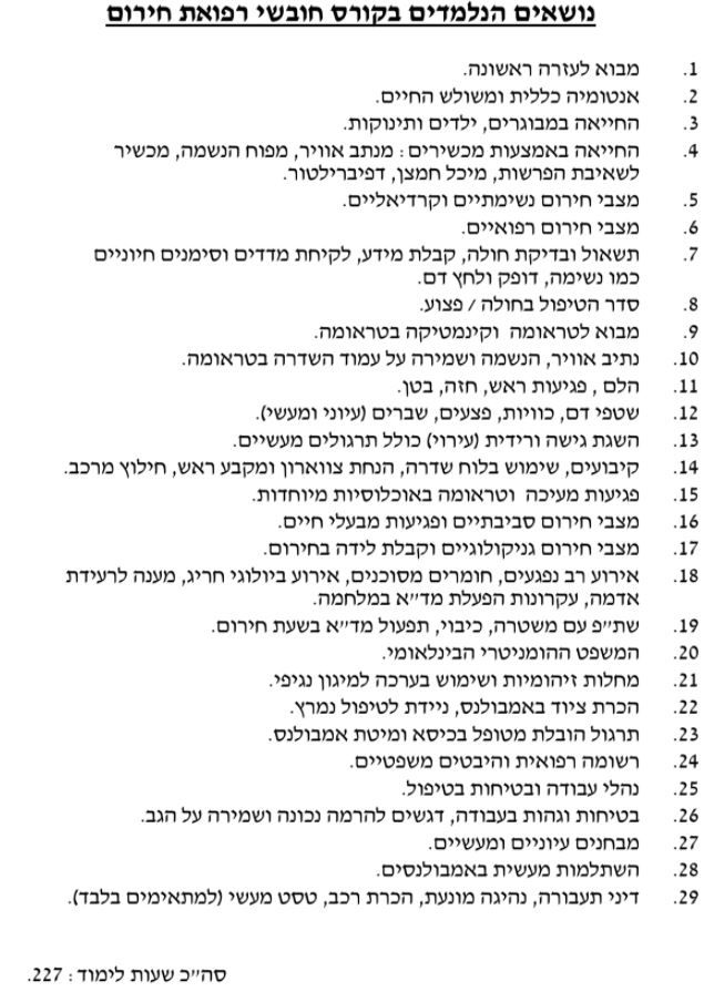 כל משתתפת תקבל ספר ''רפואת חירום לחובש'' וגישה לאתר הקורסים המתוקשב של מד''א.