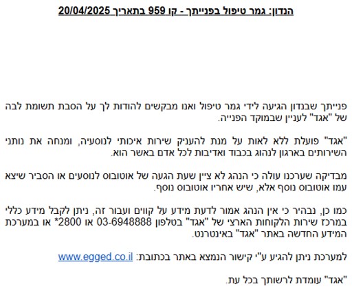 פנייתך נבדקה מול נתוני הביצוע של מפעיל התחבורה הציבורית במערכות המשרד, והוחלט להעבירה