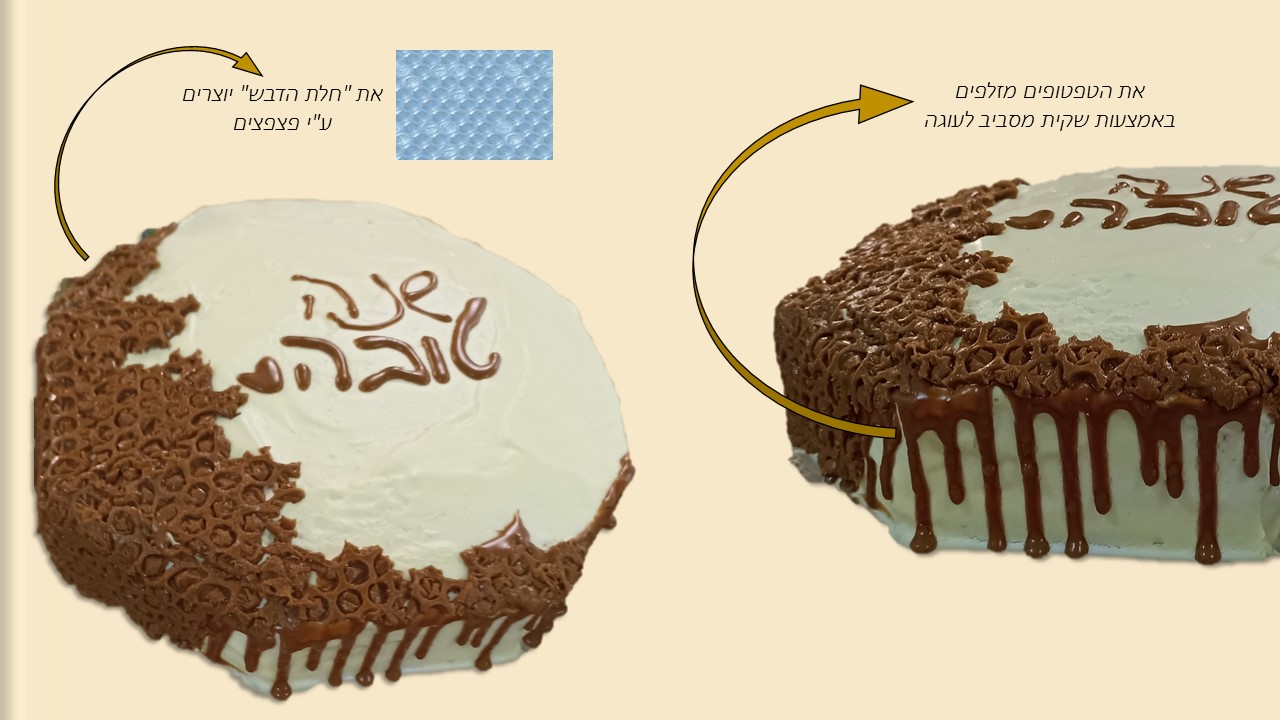 כיוון שרציתי שהעוגה תהיה פרווה, הטפטופים וחלת הדבש עשויים ממרח לוטוס: