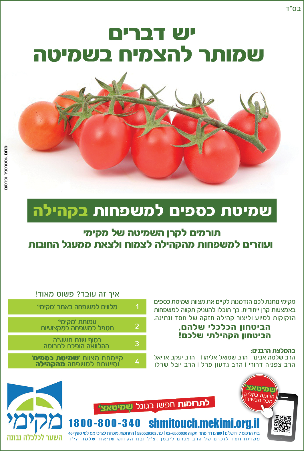 עמותת מקימי פועלת כ 5 שנים במתן סיוע כלכלי למשפחות שנקלעו לקשיים כלכליים. ע"י גיוס קהילתי. בשנה זו (שנת שמיטה) חלה גם חובת שמיטת כספים, ומקימי הקימה קרן