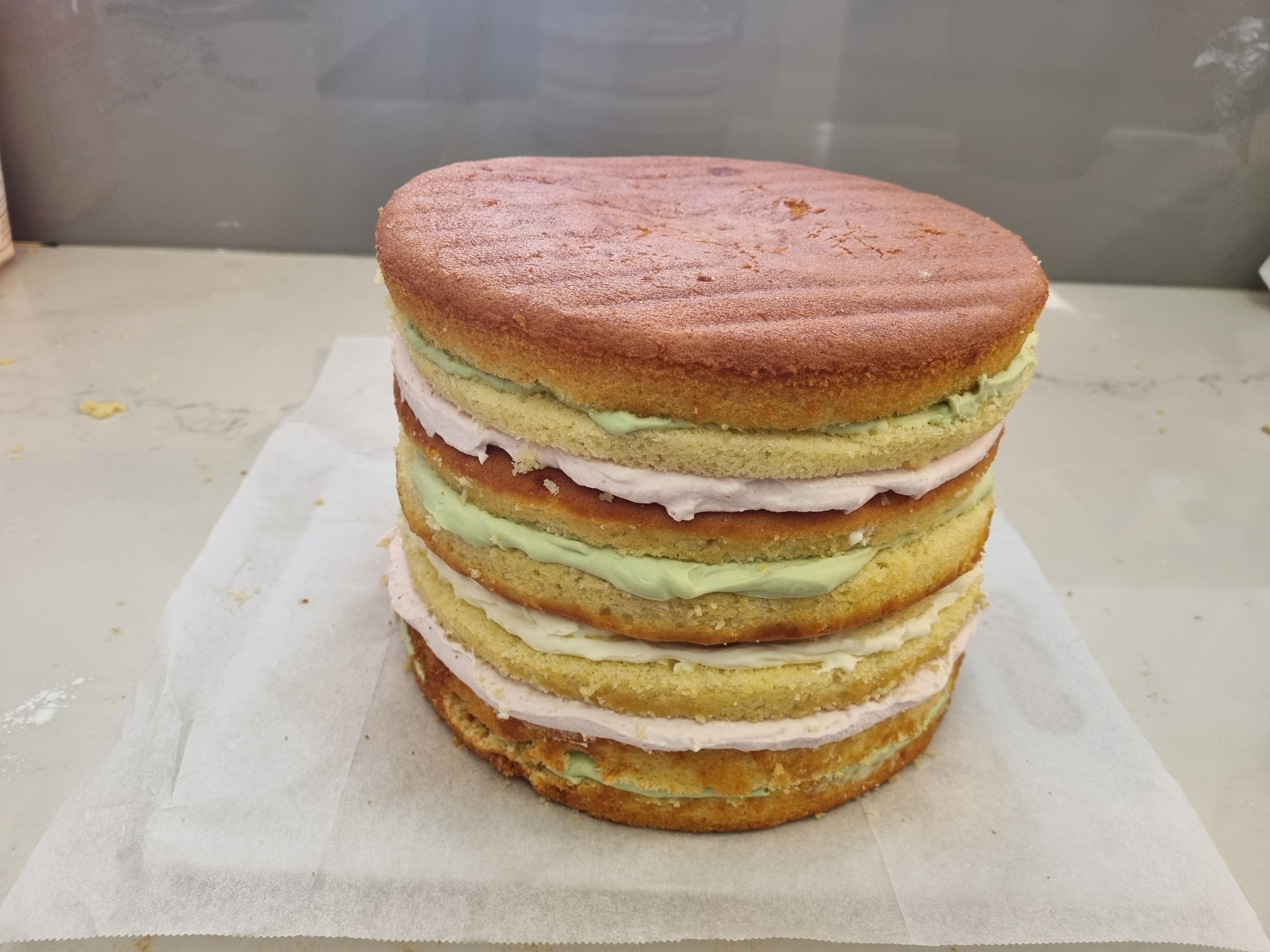 4 עוגות שכל אחת חתוכה לשתיים כך שהיו לי 8 שכבות ( ביניהן היה קרם שמנת פיסטוק ושמנת תות לסירוגין)