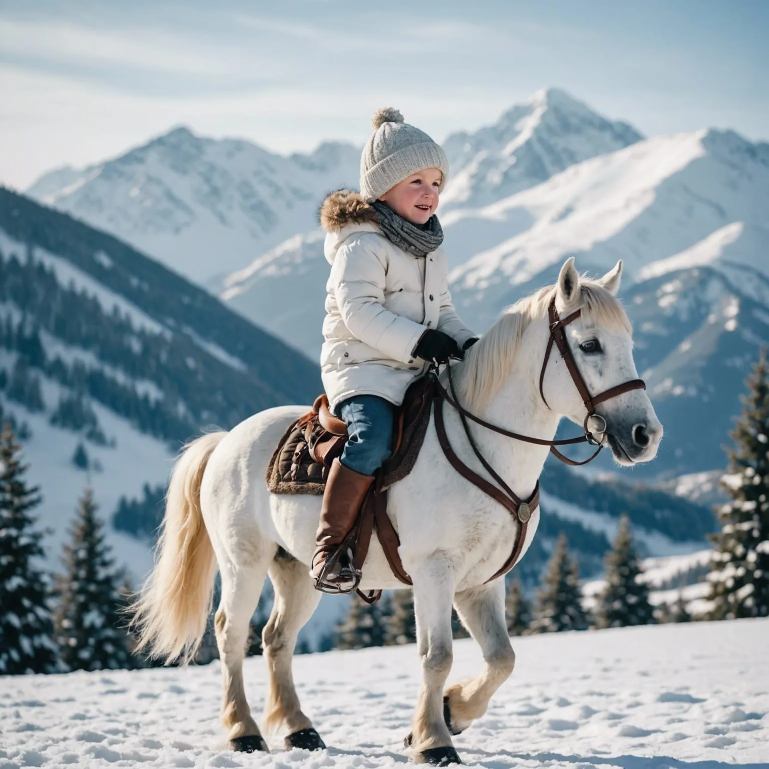 ביקשתי ילד לבוש בגדי חורף לבנים רוכב על סוס לבן ברקע הרים עם שלג