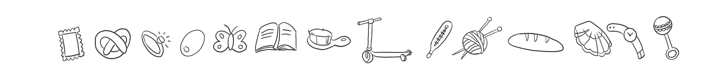 קשקשן, בקבוק תינוק, מסרגות, לחם, איגרת/מכתב, ספר, צדף, מדחום, גלגל של מיטה, טבעת יהלום, שעון, פרפר, ביגלה.