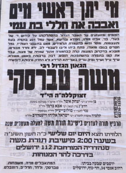 מוקדם יותר, הותר לפרסום שמו של נרצח נוסף, הרב משה טברסקי, ראש כולל "תורת משה". הלוויתו יוצאת בנפרד מהיכל הכולל בשכונת סנהדריה מורחבת בירושלים