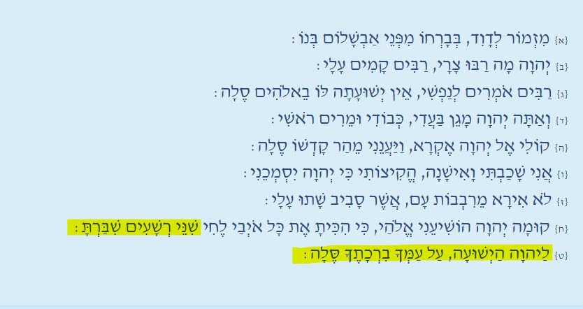 אלְדָוִד אֵלֶיךָ יי נַפְשִׁי אֶשָּׂא:באֱלֹהַי בְּךָ בָטַחְתִּי אַל אֵבוֹשָׁה אַל יַעַלְצוּ אֹיְבַי לִי:גגַּם כָּל קוֶֹיךָ לֹא יֵבֹשׁוּ יֵבֹשׁוּ הַבּוֹגְדִים רֵיקָם:דדְּרָכֶיךָ יי הוֹדִיעֵנִי אֹרְחוֹתֶיךָ לַמְּדֵנִי:ההַדְרִיכֵנִי בַאֲמִתֶּךָ וְלַמְּדֵנִי כִּי אַתָּה אֱלֹהֵי יִשְׁעִי אוֹתְךָ קִוִּיתִי כָּל הַיּוֹם:וזְכֹר רַחֲמֶיךָ יי וַחֲסָדֶיךָ כִּי מֵעוֹלָם הֵמָּה:זחַטֹּאות נְעוּרַי וּפְשָׁעַי אַל תִּזְכֹּר כְּחַסְדְּךָ זְכָר לִי אַתָּה לְמַעַן טוּבְךָ יי:חטוֹב וְיָשָׁר יי עַל כֵּן יוֹרֶה חַטָּאִים בַּדָּרֶךְ:טיַדְרֵךְ עֲנָוִים בַּמִּשְׁפָּט וִילַמֵּד עֲנָוִים דַּרְכּוֹ:יכָּל אָרְחוֹת יי חֶסֶד וֶאֱמֶת לְנֹצְרֵי בְרִיתוֹ וְעֵדֹתָיו:יאלְמַעַן שִׁמְךָ יי וְסָלַחְתָּ לַעֲוֹנִי כִּי רַב הוּא:יבמִי זֶה הָאִישׁ יְרֵא יי יוֹרֶנּוּ בְּדֶרֶךְ יִבְחָר:יגנַפְשׁוֹ בְּטוֹב תָּלִין וְזַרְעוֹ יִירַשׁ אָרֶץ:ידסוֹד יי לִירֵאָיו וּבְרִיתוֹ לְהוֹדִיעָם:טועֵינַי תָּמִיד אֶל יי כִּי הוּא יוֹצִיא מֵרֶשֶׁת רַגְלָי:טזפְּנֵה אֵלַי וְחָנֵּנִי כִּי יָחִיד וְעָנִי אָנִי:יזצָרוֹת לְבָבִי הִרְחִיבוּ מִמְּצוּקוֹתַי הוֹצִיאֵנִי:יחרְאֵה עָנְיִי וַעֲמָלִי וְשָׂא לְכָל חַטֹּאותָי:יטרְאֵה אוֹיְבַי כִּי רָבּוּ וְשִׂנְאַת חָמָס שְׂנֵאוּנִי:כשָׁמְרָה נַפְשִׁי וְהַצִּילֵנִי אַל אֵבוֹשׁ כִּי חָסִיתִי בָךְ:כאתֹּם וָיֹשֶׁר יִצְּרוּנִי כִּי קִוִּיתִיךָ:כבפְּדֵה אֱלֹהִים אֶת יִשְׂרָאֵל מִכֹּל צָרוֹתָיו: