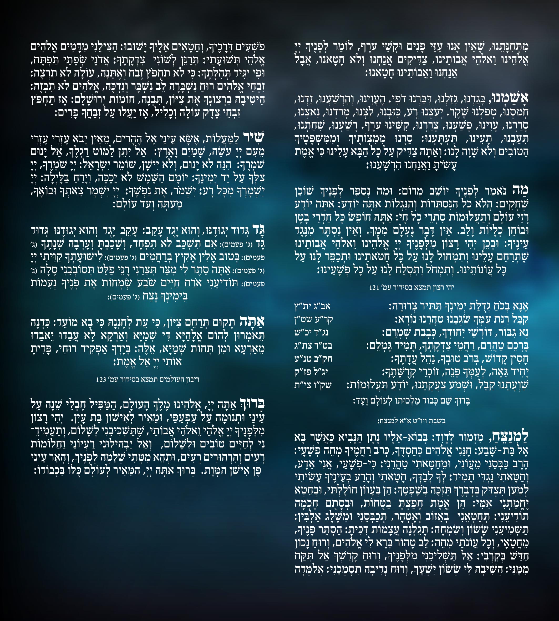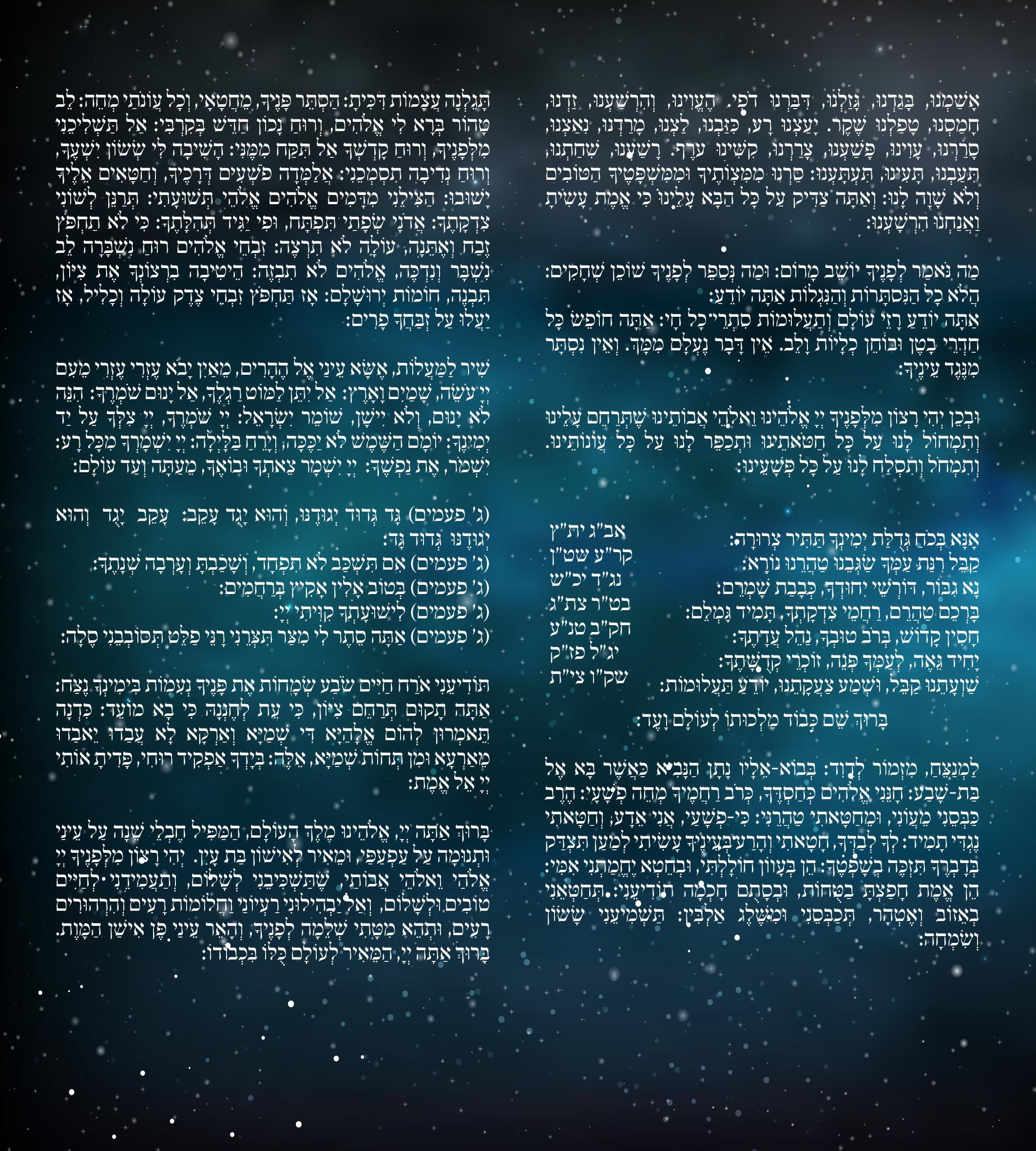 אלְדָוִד אֵלֶיךָ יי נַפְשִׁי אֶשָּׂא:באֱלֹהַי בְּךָ בָטַחְתִּי אַל אֵבוֹשָׁה אַל יַעַלְצוּ אֹיְבַי לִי:גגַּם כָּל קוֶֹיךָ לֹא יֵבֹשׁוּ יֵבֹשׁוּ הַבּוֹגְדִים רֵיקָם:דדְּרָכֶיךָ יי הוֹדִיעֵנִי אֹרְחוֹתֶיךָ לַמְּדֵנִי:ההַדְרִיכֵנִי בַאֲמִתֶּךָ וְלַמְּדֵנִי כִּי אַתָּה אֱלֹהֵי יִשְׁעִי אוֹתְךָ קִוִּיתִי כָּל הַיּוֹם:וזְכֹר רַחֲמֶיךָ יי וַחֲסָדֶיךָ כִּי מֵעוֹלָם הֵמָּה:זחַטֹּאות נְעוּרַי וּפְשָׁעַי אַל תִּזְכֹּר כְּחַסְדְּךָ זְכָר לִי אַתָּה לְמַעַן טוּבְךָ יי:חטוֹב וְיָשָׁר יי עַל כֵּן יוֹרֶה חַטָּאִים בַּדָּרֶךְ:טיַדְרֵךְ עֲנָוִים בַּמִּשְׁפָּט וִילַמֵּד עֲנָוִים דַּרְכּוֹ:יכָּל אָרְחוֹת יי חֶסֶד וֶאֱמֶת לְנֹצְרֵי בְרִיתוֹ וְעֵדֹתָיו:יאלְמַעַן שִׁמְךָ יי וְסָלַחְתָּ לַעֲוֹנִי כִּי רַב הוּא:יבמִי זֶה הָאִישׁ יְרֵא יי יוֹרֶנּוּ בְּדֶרֶךְ יִבְחָר:יגנַפְשׁוֹ בְּטוֹב תָּלִין וְזַרְעוֹ יִירַשׁ אָרֶץ:ידסוֹד יי לִירֵאָיו וּבְרִיתוֹ לְהוֹדִיעָם:טועֵינַי תָּמִיד אֶל יי כִּי הוּא יוֹצִיא מֵרֶשֶׁת רַגְלָי:טזפְּנֵה אֵלַי וְחָנֵּנִי כִּי יָחִיד וְעָנִי אָנִי:יזצָרוֹת לְבָבִי הִרְחִיבוּ מִמְּצוּקוֹתַי הוֹצִיאֵנִי:יחרְאֵה עָנְיִי וַעֲמָלִי וְשָׂא לְכָל חַטֹּאותָי:יטרְאֵה אוֹיְבַי כִּי רָבּוּ וְשִׂנְאַת חָמָס שְׂנֵאוּנִי:כשָׁמְרָה נַפְשִׁי וְהַצִּילֵנִי אַל אֵבוֹשׁ כִּי חָסִיתִי בָךְ:כאתֹּם וָיֹשֶׁר יִצְּרוּנִי כִּי קִוִּיתִיךָ:כבפְּדֵה אֱלֹהִים אֶת יִשְׂרָאֵל מִכֹּל צָרוֹתָיו: