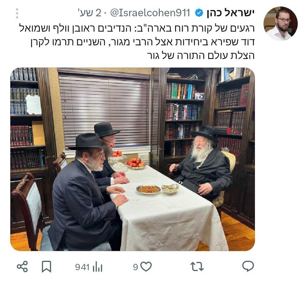 ומכאן ואילך, בחדר צדדי נערכת קבלת קהל מיוחדת. בזה אחר זה נכנסים הנגידים. מוסיפים ונותנים וזוכים לרגעי יחידות להם ולבני משפחותיהם. קבלת הקהל נמשכת זמן ארוך מאוד. הנתינות הולכות ונערמות. להביא סיוע שיש בו ממש.