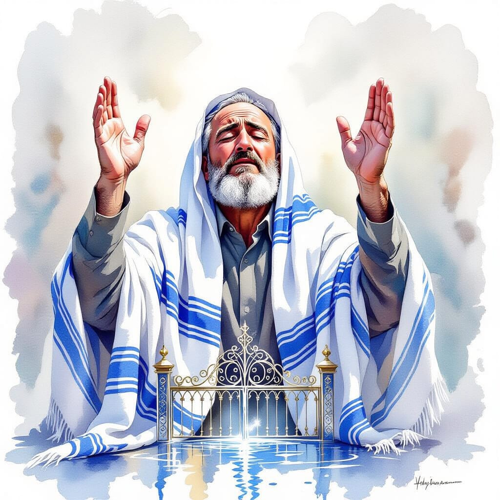 ציור מרובע בסגנון צבעי מים של תקריב של גבר יהודי עומד בראש הר מופנם ועיניו סגורות. הוא עטוף בטלית לבנה שמתנופפת ברוח כמו גלימה, וידיו פרושות אל על. ברקע המרוח והעדין הרים מושלגים עשוי מערפל, אור חמים וגוונים של זהב ואדום. שמיים סוערים בצבעי כחול וסגול כהה, אך קרן אור רכה ואלוקית מאירה אותו מלמעלה. תתמקד ביהודי. האווירה הרואית, רוחנית ומרגשת – שילוב של תקווה, עוצמה ואמונה. צבעי מים רכים, קווים מטושטשים, סגנון אמנותי, ציור בעבודת יד.