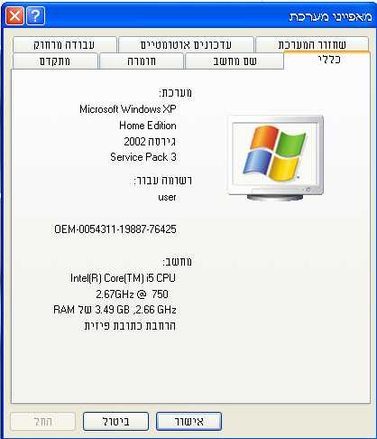 לחצי לחצן ימני על אייקון המחשב שלי שבשולחן העבודה > מאפיינים > יפתח לך חלון בו רשום איזו מערכת הפעלה מותקנת, מהי מהירות המעבד כרגע ומה כמות הזיכרון. העלי לפה את התשובה ונתקדם.