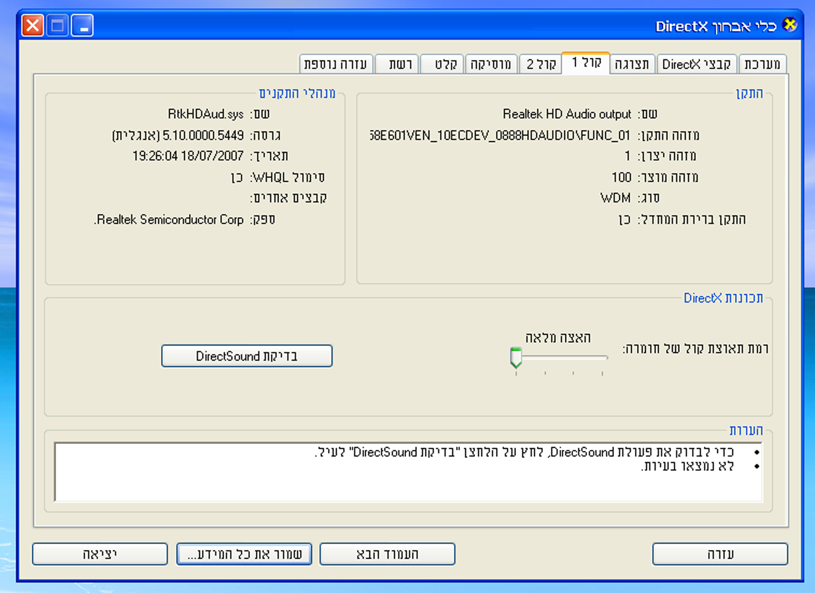 התחל>הפעלה>DXDIAG>קול>מה כתוב שם?